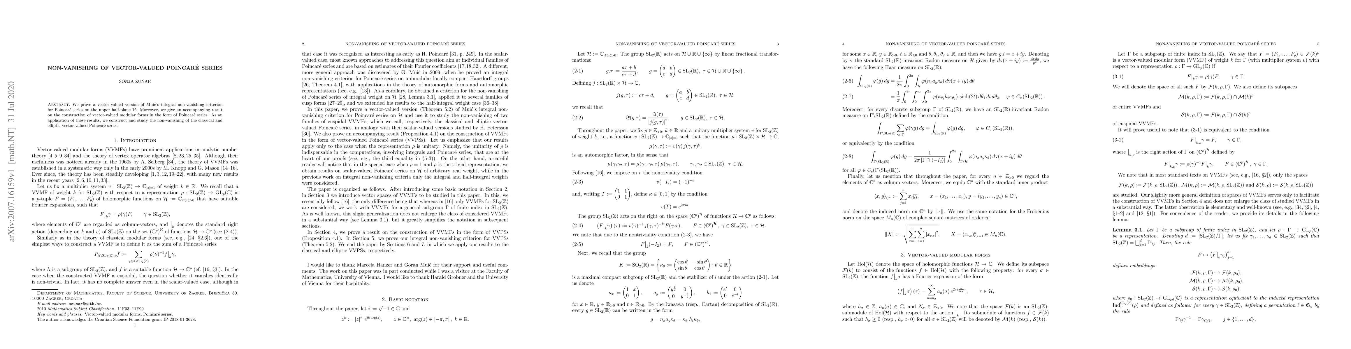 The paper proves a vector-valued version of Mui\'c's integral non-vanishing criterion for Poincar\'e series on the upper half-plane $ \mathcal H $, and constructs vector-valued modular forms via Poincar\'e series.