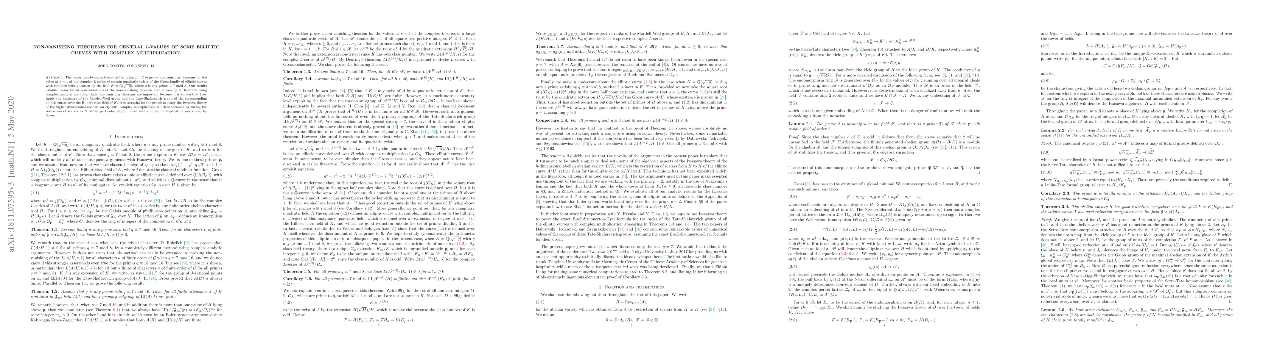 The paper uses Iwasawa theory at the prime $p=2$ to prove non-vanishing theorems for the value at $s=1$ of the complex $L$-series of certain quadratic twists of the Gross family of elliptic curves with complex multiplication by the field $K = \BQ(\sqrt{-q})$, where $q$ is any prime $\equiv 7 \mod 8$. Our results establish some broad generalizations of the non-vanishing theorem first proven by D. Rohrlich using complex analytic methods. Such non-vanishing theorems are important because it is known that they imply the finiteness of the Mordell-Weil group and the Tate-Shafarevich group of the corresponding elliptic curves over the Hilbert class field of $K$. It is essential for the proofs to study the Iwasawa theory of the higher dimensional abelian variety with complex multiplication which is obtained by taking the restriction of scalars to $K$ of the particular elliptic curve with complex multiplication introduced by Gross.