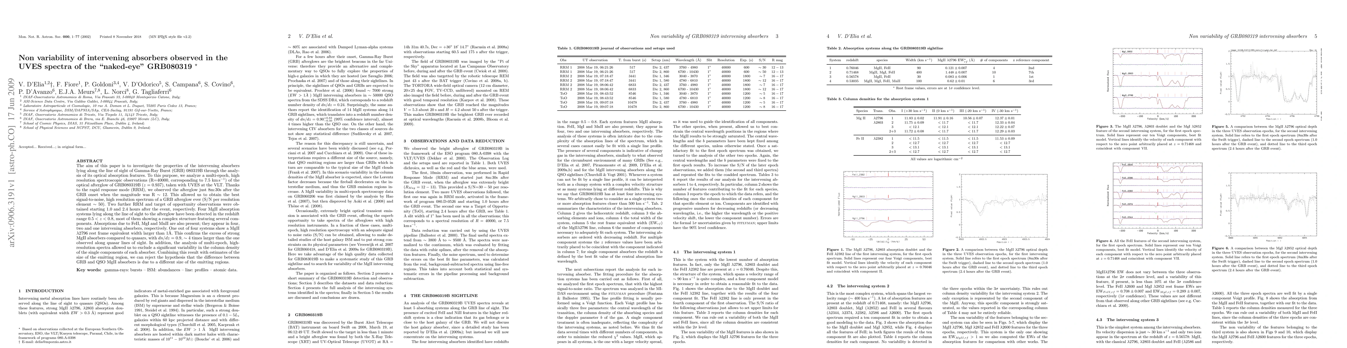 The aim of this paper is to investigate the properties of the intervening absorbers lying along the line of sight of Gamma-Ray Burst (GRB) 080319B through the analysis of its optical absorption features. To this purpose, we analyze a multi-epoch, high resolution spectroscopic observations (R=40000, corresponding to 7.5 km/s) of the optical afterglow of GRB080319B (z=0.937), taken with UVES at the VLT. Thanks to the rapid response mode (RRM), we observed the afterglow just 8m:30s after the GRB onset when the magnitude was R ~ 12. This allowed us to obtain the best signal-to-noise, high resolution spectrum of a GRB afterglow ever (S/N per resolution element ~ 50). Two further RRM and target of opportunity observations were obtained starting 1.0 and 2.4 hours after the event, respectively. Four MgII absorption systems lying along the line of sight to the afterglow have been detected in the redshift range 0.5 < z < 0.8, most of them showing a complex structure featuring several components. Absorptions due to FeII, MgI and MnII are also present; they appear in four, two and one intervening absorbers, respectively. One out of four systems show a MgII2796 rest frame equivalent width larger than 1A. This confirms the excess of strong MgII absorbers compared to quasars, with dn/dz = 0.9, ~ 4 times larger than the one observed along quasar lines of sight. In addition, the analysis of multi-epoch, high-resolution spectra allowed us to exclude a significant variability in the column density of the single components of each absorber. Combining this result with estimates of the size of the emitting region, we can reject the hypothesis that the difference between GRB and QSO MgII absorbers is due to a different size of the emitting regions.