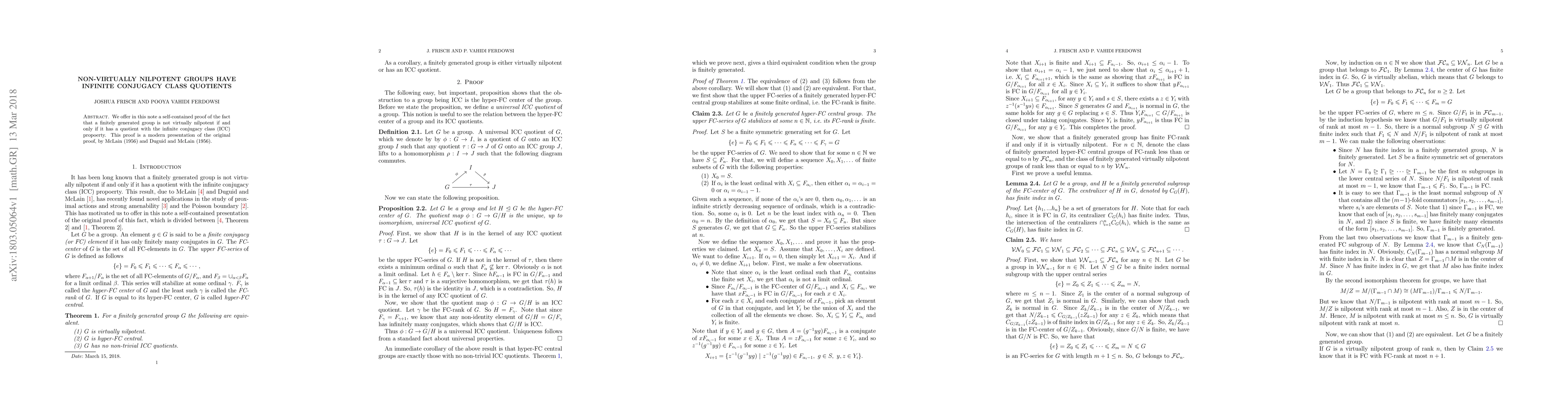 We offer in this note a self-contained proof of the fact that a finitely generated group is not virtually nilpotent if and only if it has a quotient with the infinite conjugacy class (ICC) propoerty. This proof is a modern presentation of the original proof, by McLain (1956) and Duguid and McLain (1956).