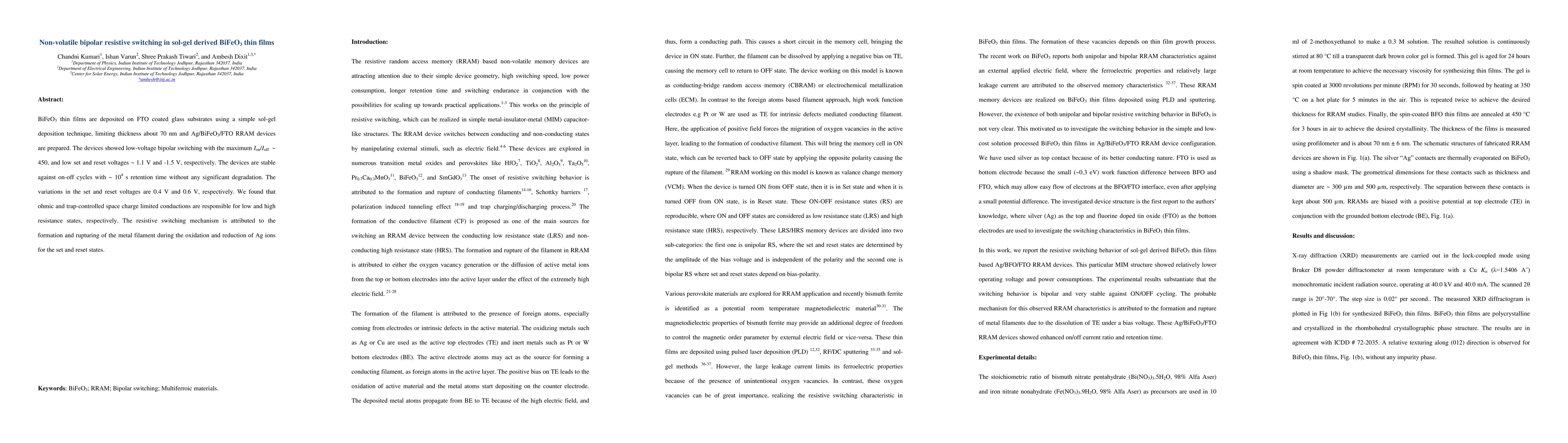 This paper investigates the resistive switching behavior in sol-gel derived BiFeO3 thin films, demonstrating low-voltage bipolar switching with high Ion/Ioff ratio and stable performance over cycles. The resistive switching mechanism is attributed to the formation and rupturing of metal filaments due to the oxidation and reduction of Ag ions.