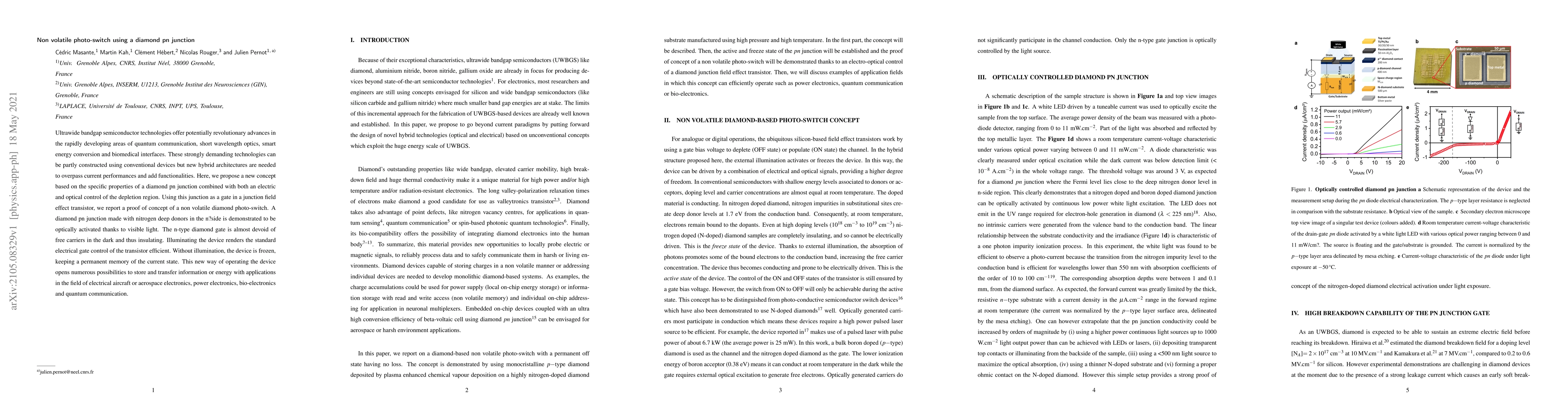 This paper proposes a non-volatile photo-switch based on a diamond pn junction, demonstrating its ability to be optically activated by visible light while maintaining a permanent memory state without illumination. The concept holds potential for applications in quantum communication, aerospace electronics, and power electronics.