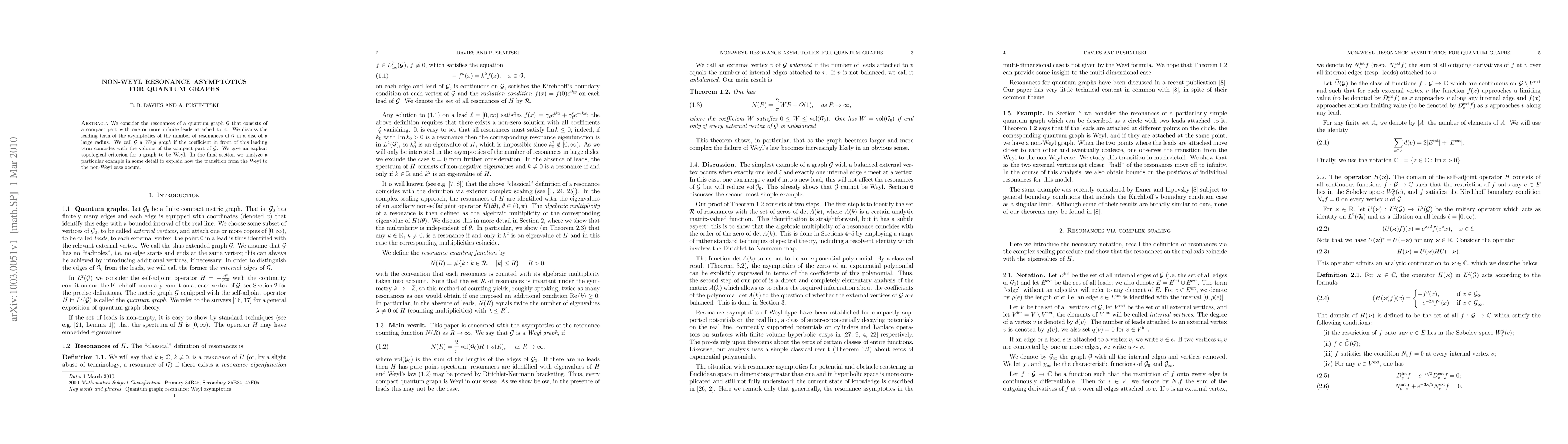 This paper investigates the resonances of quantum graphs with infinite leads, focusing on the asymptotic behavior of the number of resonances in large regions. It provides a topological criterion to distinguish Weyl graphs, where the leading term matches the compact part's volume, from non-Weyl graphs, and analyzes a specific example to illustrate the transition between these two cases.
