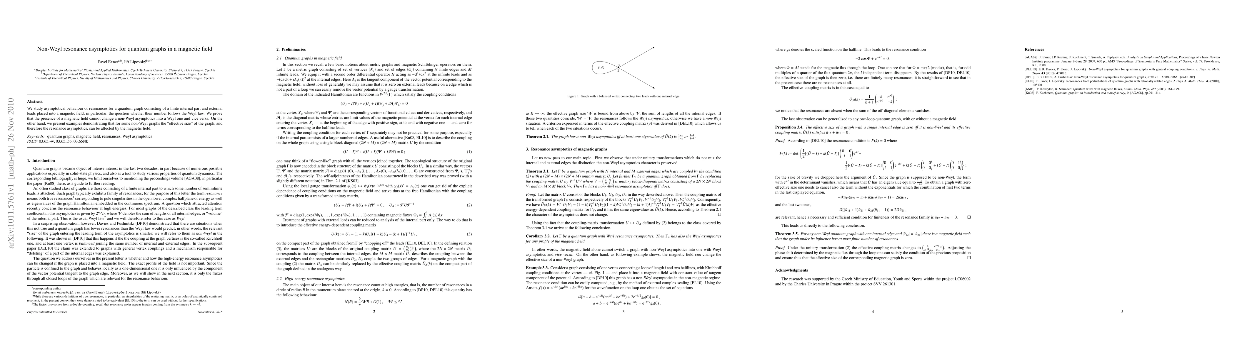 This paper investigates the asymptotic behavior of resonances in quantum graphs with internal parts and external leads under a magnetic field, confirming that the presence of a magnetic field does not alter the non-Weyl to Weyl transition in resonance asymptotics. It also shows that magnetic fields can influence the "effective size" of certain non-Weyl graphs, thereby affecting their resonance asymptotics.