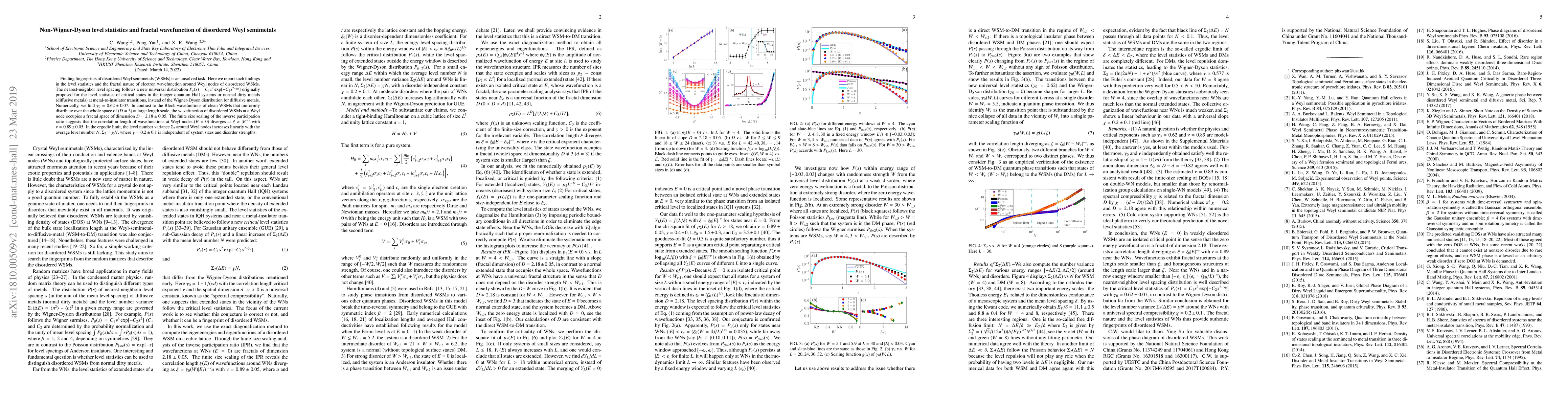 This paper identifies unique level statistics and fractal wavefunction characteristics in disordered Weyl semimetals, revealing a non-Wigner-Dyson distribution for level spacing and a fractal dimension of 2.18 for wavefunctions around Weyl nodes. The findings suggest a correlation length divergence and a linear increase in level number variance with average level number.