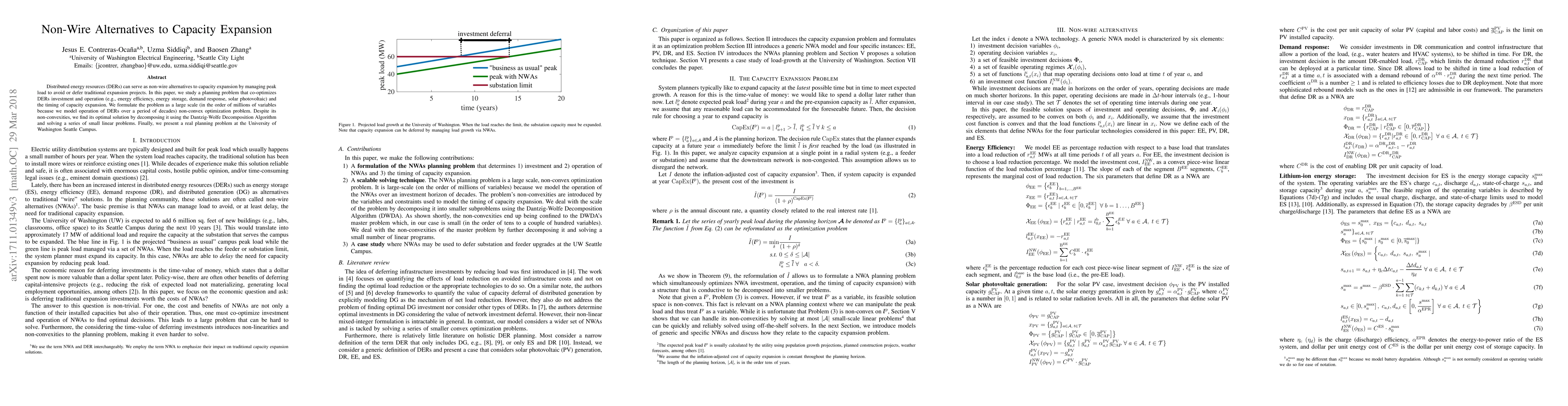 Distributed energy resources (DERs) can serve as non-wire alternatives to capacity expansion by managing peak load to avoid or defer traditional expansion projects. In this paper, we study a planning problem that co-optimizes DERs investment and operation (e.g., energy efficiency, energy storage, demand response, solar photovoltaic) and the timing of capacity expansion. We formulate the problem as a large scale (in the order of millions of variables because we model the operation of DERs over a period of decades) non-convex optimization problem. Despite its non-convexities, we find its optimal solution by decomposing it using the Dantzig-Wolfe Decomposition Algorithm and solving a series of small linear problems. Finally, we present a real planning problem at the University of Washington Seattle Campus.