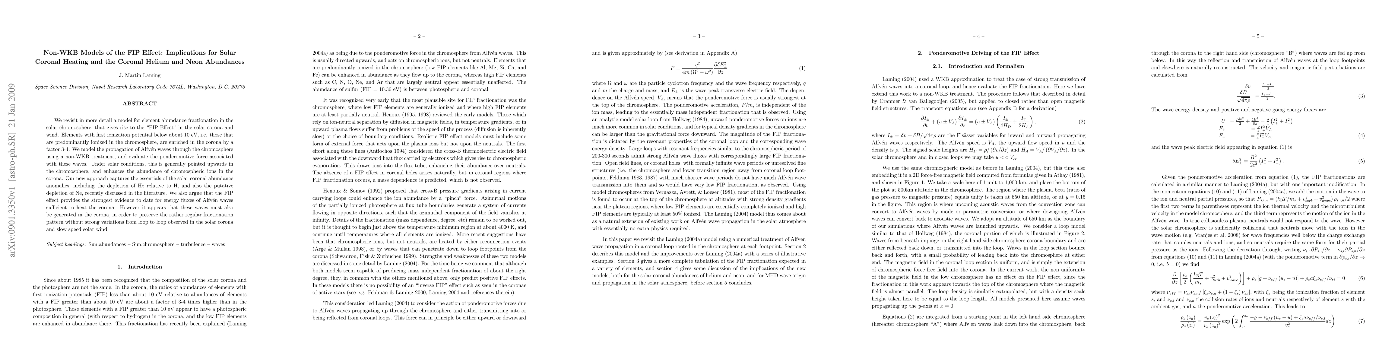 This paper proposes a non-WKB model to explain the FIP effect, showing how Alfven waves enhance the abundance of low first ionization potential elements in the solar corona, leading to observed abundance anomalies like He and Ne depletion. It suggests Alfven wave energy fluxes are crucial for coronal heating, but these waves must originate in the corona to maintain consistent fractionation patterns.