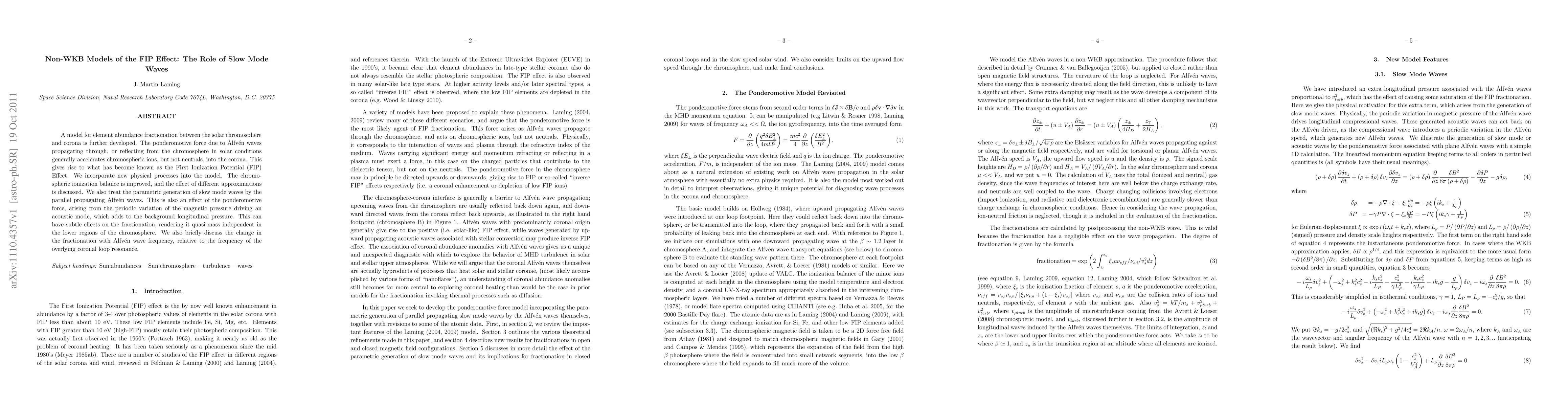 This paper develops a model for the FIP Effect, showing how Alfven waves accelerate chromospheric ions into the corona, leading to element abundance fractionation. It introduces slow mode waves generated by Alfven waves, which can affect fractionation in the lower chromosphere and alter its dependence on mass and Alfven wave frequency.