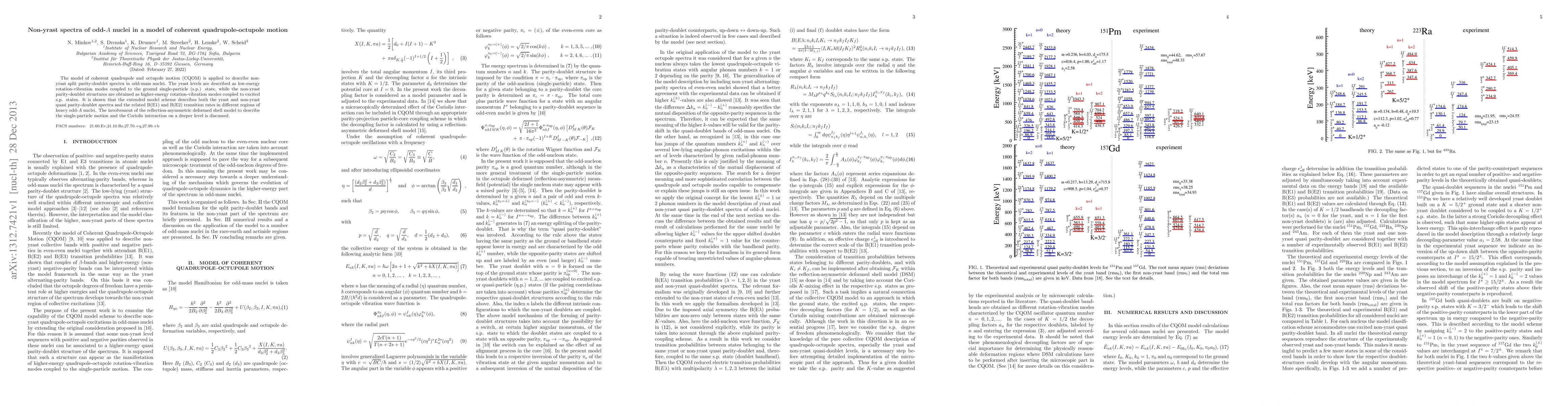 This paper applies the coherent quadrupole-octupole motion model to explain non-yrast spectra in odd-mass nuclei, showing how rotation-vibration modes coupled with single-particle states produce parity-doublet structures. The extended model also accurately describes B(E1) and B(E2) transition rates across various heavy odd-A nuclei.