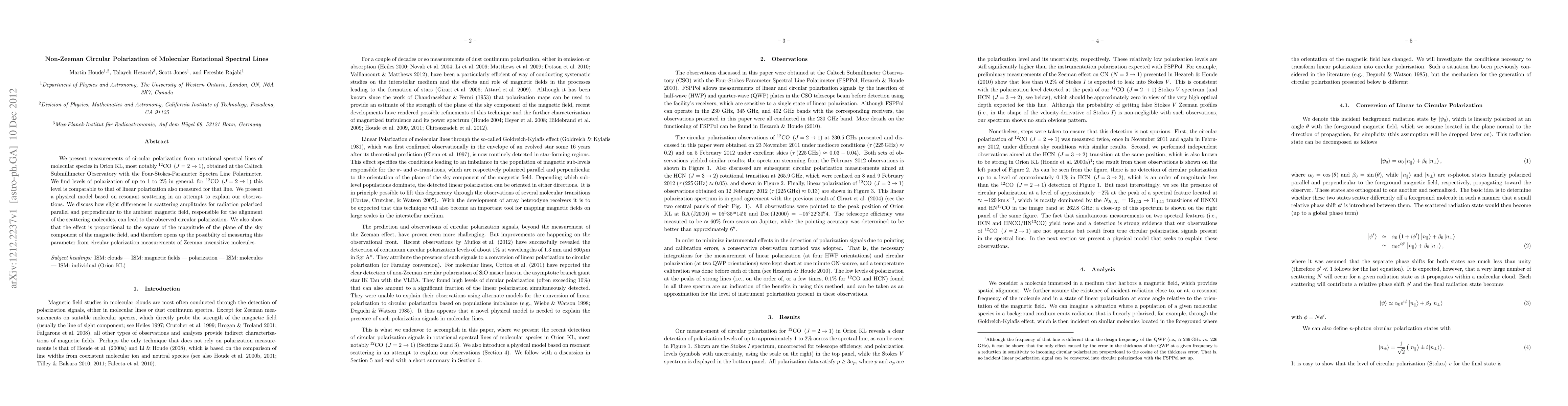 This study measures non-Zeeman circular polarization in molecular rotational lines of 12CO in Orion KL, revealing up to 2% polarization levels. A physical model based on resonant scattering explains the observed polarization, suggesting it is proportional to the square of the magnetic field's plane-of-sky component, providing a method to measure this magnetic field parameter.