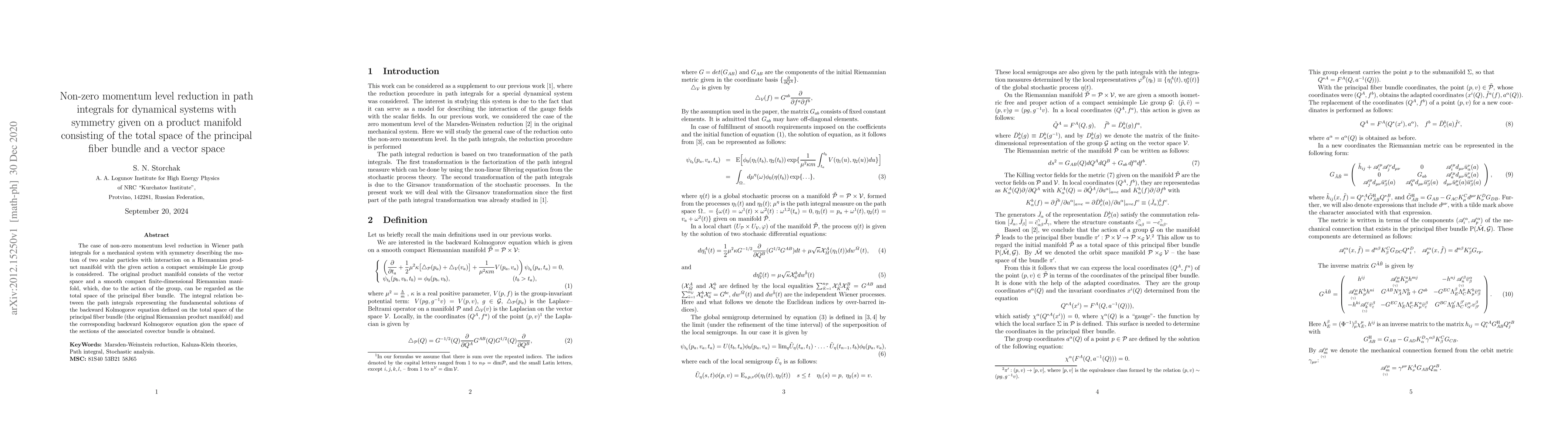 The case of non-zero momentum level reduction in Wiener path integrals for a mechanical system with symmetry describing the motion of two scalar particles with interaction on a Riemannian product manifold with the given action a compact semisimple Lie group is considered. The original product manifold consists of the vector space and a smooth compact finite-dimensional Riemannian manifold, which, due to the action of the group, can be regarded as the total space of the principal fiber bundle. The integral relation between the path integrals representing the fundamental solutions of the backward Kolmogorov equation defined on the total space of the principal fiber bundle (the original Riemannian product manifold) and the corresponding backward Kolmogorov equation gion the space of the sections of the associated covector bundle is obtained.