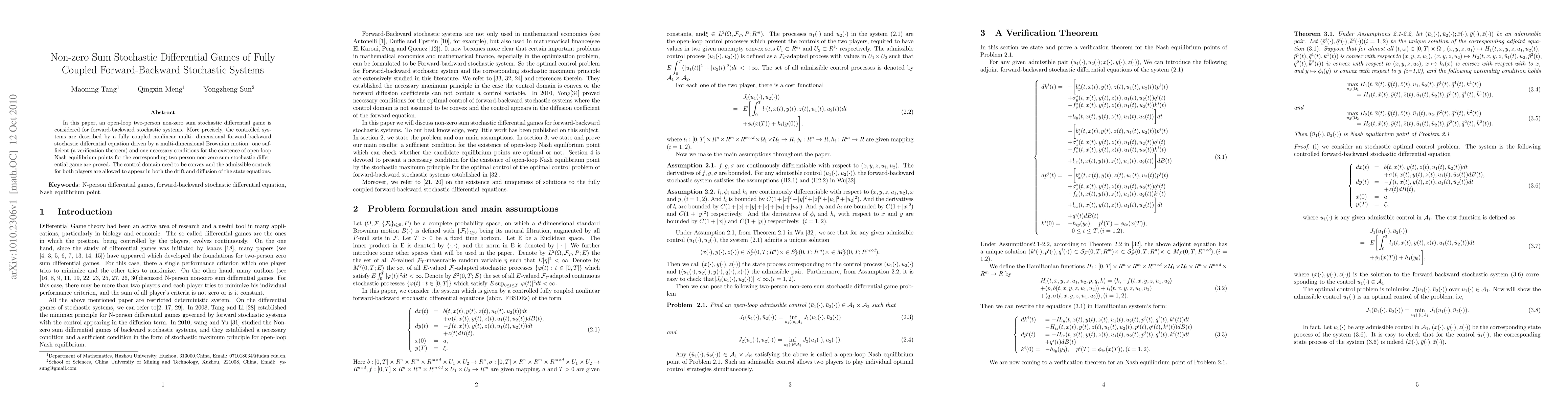 The research develops a verification theorem and necessary conditions for the existence of open-loop Nash equilibrium points in a non-zero sum stochastic differential game governed by fully coupled forward-backward stochastic systems.