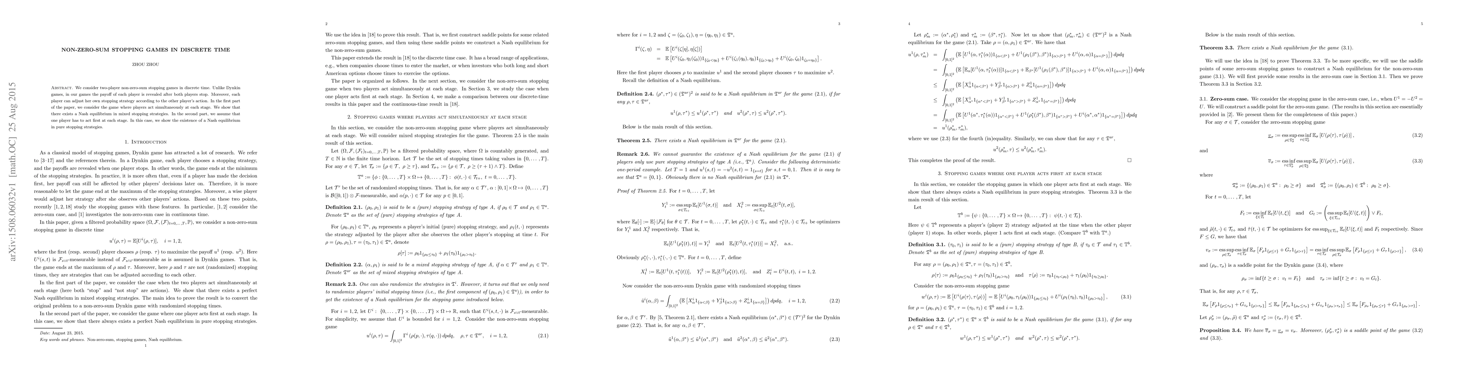 Summary: This paper investigates two-player non-zero-sum stopping games in discrete time where payoffs are revealed post-stopping and players can adapt strategies. It demonstrates the existence of Nash equilibria in mixed strategies for simultaneous actions and in pure strategies when one player acts first.