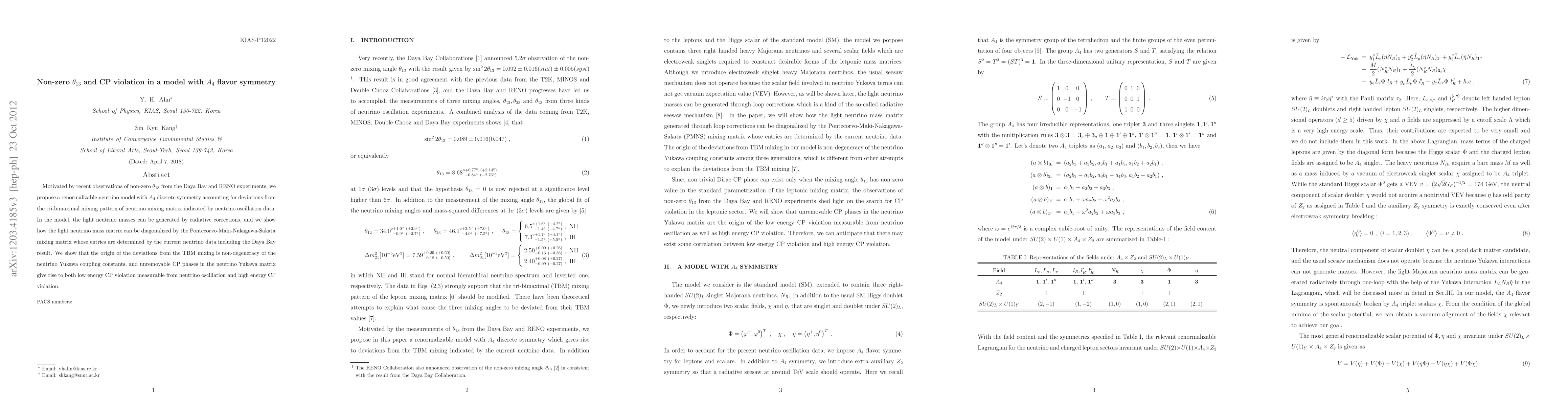This paper proposes a neutrino model with $A_4$ flavor symmetry to explain the observed non-zero $\theta_{13}$ angle, generating light neutrino masses via radiative corrections. It demonstrates how CP violation arises from non-degenerate Yukawa coupling constants and unremovable CP phases.