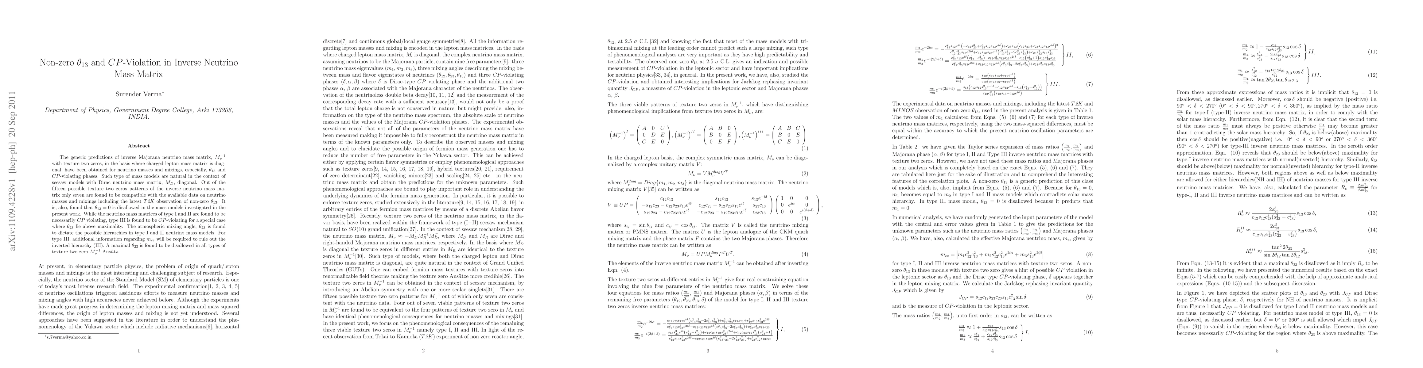 The generic predictions of inverse Majorana neutrino mass matrix, $M_{\nu}^{-1}$ with texture two zeros, in the basis where charged lepton mass matrix is diagonal, have been obtained for neutrino masses and mixings, especially, $\theta_{13}$ and CP-violating phases. Such type of mass models are natural in the context of seesaw models with Dirac neutrino mass matrix, $M_{D}$, diagonal. Out of the fifteen possible texture two zeros patterns of the inverse neutrino mass matrix only seven are found to be compatible with the available data on neutrino masses and mixings including the latest $T\emph{2}K$ observation of non-zero $\theta_{13}$. It is, also, found that $\theta_{13}=0$ is disallowed in the mass models investigated in the present work. While the neutrino mass matrices of type I and II are found to be necessarily CP violating, type III is found to be CP-violating for a special case where $\theta_{23}$ lie above maximality. The atmospheric mixing angle, $\theta_{23}$ is found to dictate the possible hierarchies in type I and II neutrino mass models. For type III, additional information regarding $m_{ee}$ will be required to rule out the inverted hierarchy (IH). A maximal $\theta_{23}$ is found to be disallowed in all types of texture two zero $M_{\nu}^{-1}$ Ans$\ddot{a}$tz.