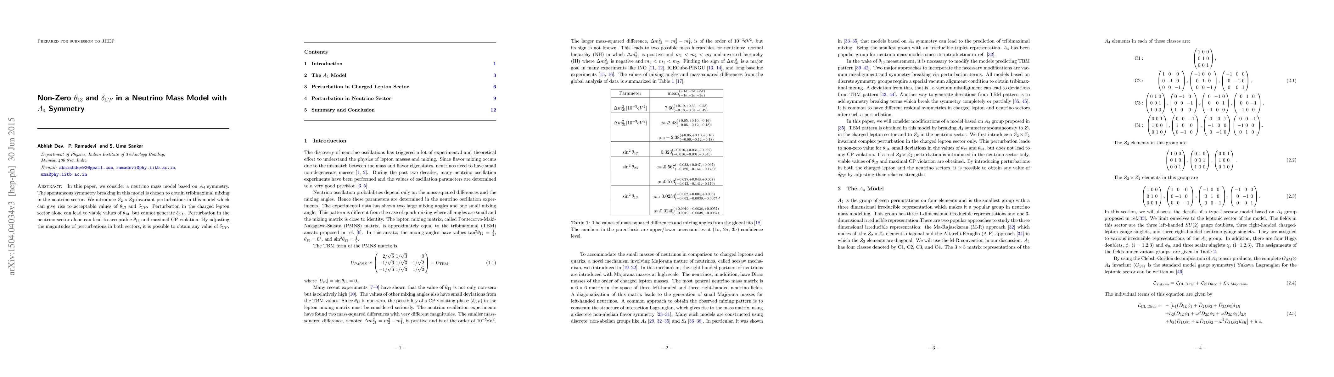 This paper explores a neutrino mass model based on $A_4$ symmetry, achieving tribimaximal mixing, and introduces $Z_2 \times Z_2$ invariant perturbations to obtain non-zero $\theta_{13}$ and $\delta_{CP}$, with adjustments in both charged lepton and neutrino sectors allowing for viable CP violation.