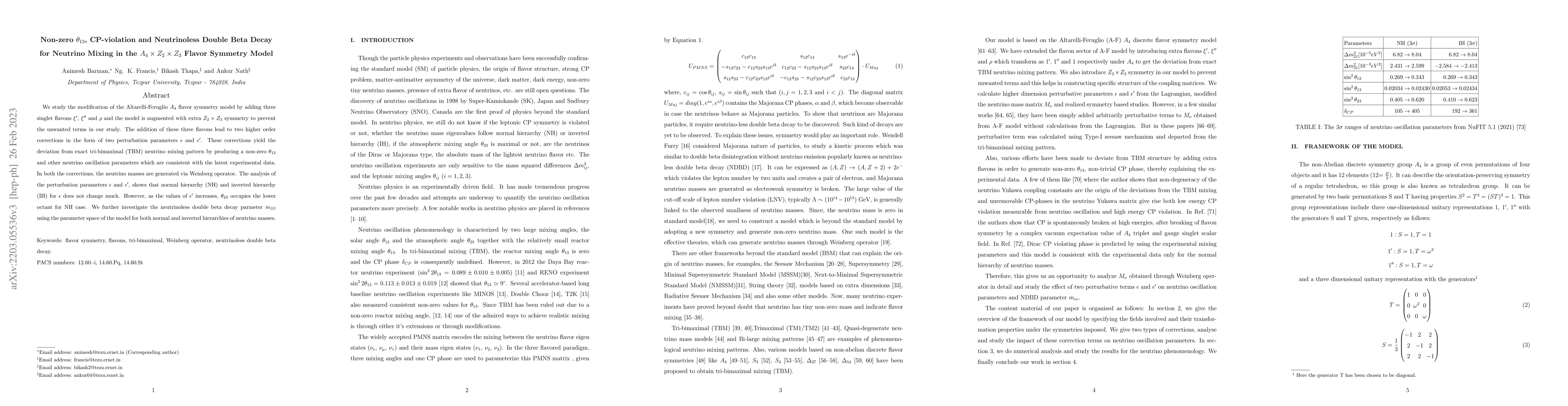 This paper modifies the Altarelli-Feruglio $A_4$ flavor symmetry model with additional singlet flavons and a $Z_2\times Z_3$ symmetry to introduce non-zero $\theta_{13}$ and CP-violation, consistent with experimental data. It also explores the implications for neutrinoless double beta decay within the model's parameter space.