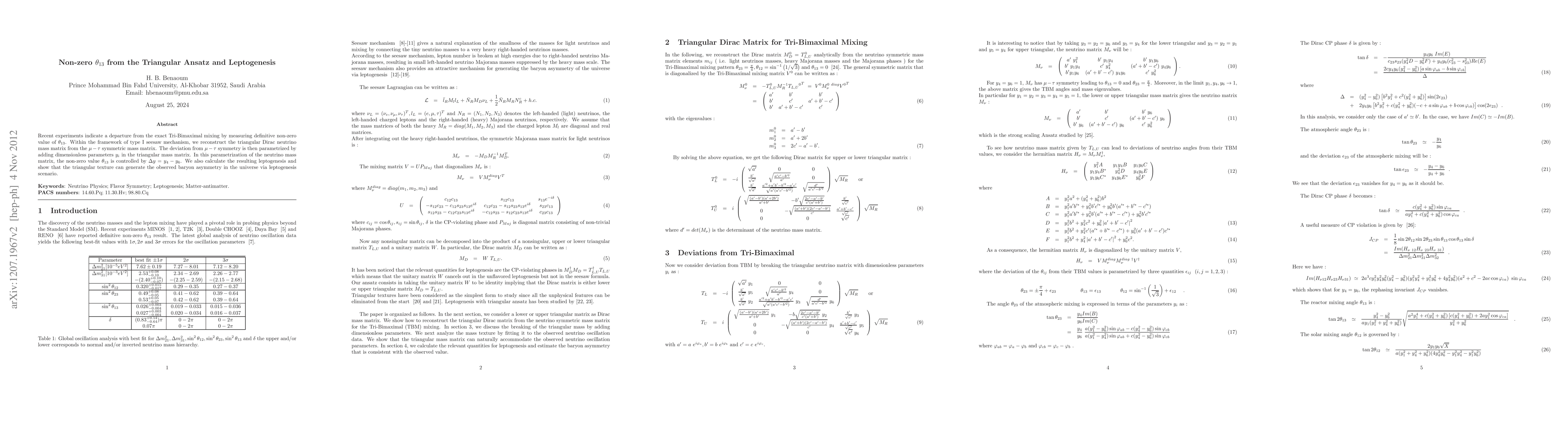 This paper explores the reconstruction of the Dirac neutrino mass matrix using a triangular ansatz, accounting for the non-zero $\theta_{13}$ observed in experiments. It demonstrates that the deviation from $\mu-\tau$ symmetry, controlled by $\Delta y$, can generate the required baryon asymmetry in the universe through the type I seesaw mechanism and leptogenesis.
