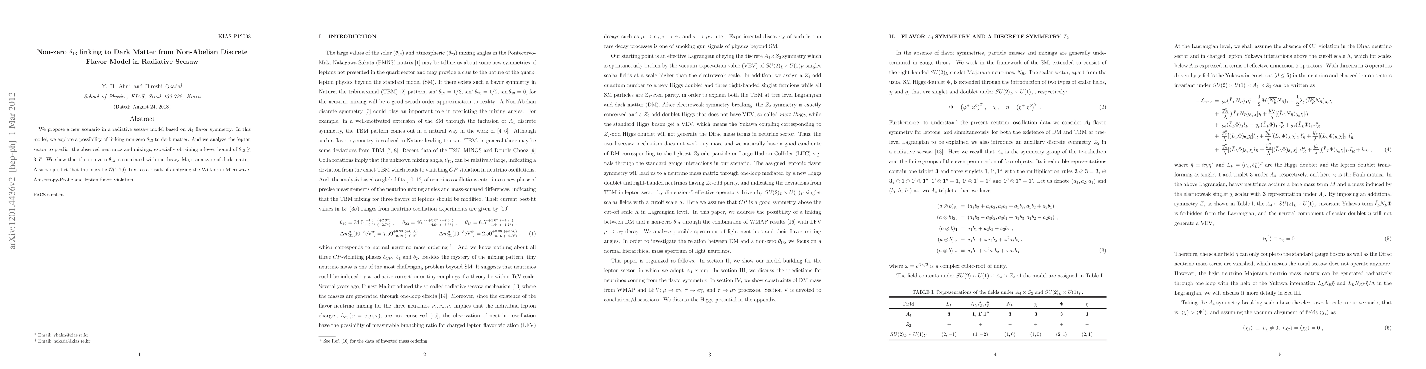This paper proposes a radiative seesaw model based on A_4 flavor symmetry linking non-zero θ₁₃ to dark matter. It predicts θ₁₃ > 3.5° and correlates θ₁₃ with heavy Majorana dark matter of O(1-10) TeV mass.