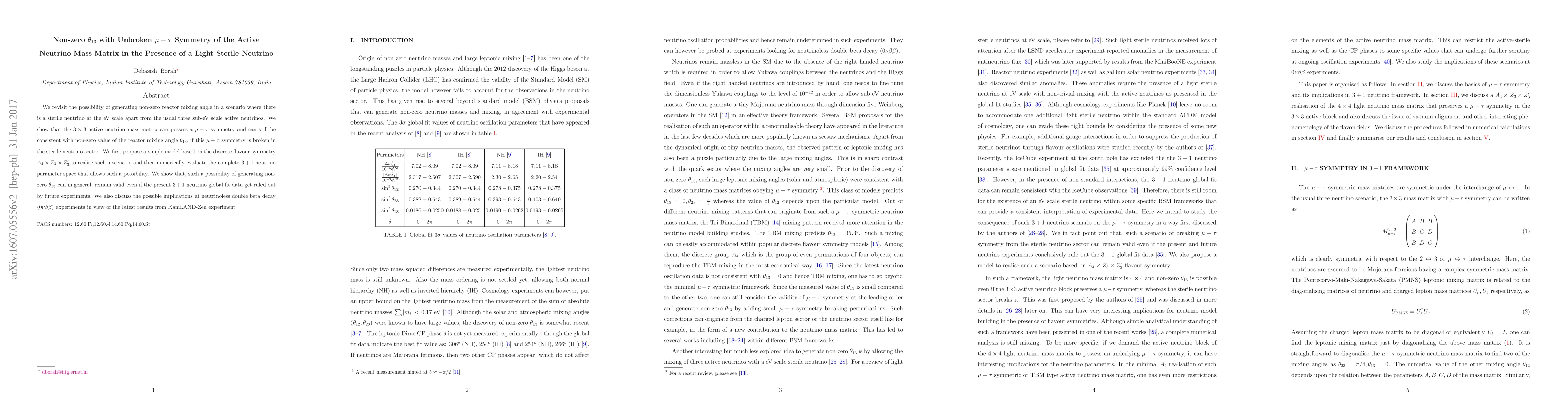 We revisit the possibility of generating non-zero reactor mixing angle in a scenario where there is a sterile neutrino at the eV scale apart from the usual three sub-eV scale active neutrinos. We show that the $3\times3$ active neutrino mass matrix can possess a $\mu-\tau$ symmetry and can still be consistent with non-zero value of the reactor mixing angle $\theta_{13}$, if this $\mu-\tau$ symmetry is broken in the sterile neutrino sector. We first propose a simple model based on the discrete flavour symmetry $A_4 \times Z_3 \times Z^{\prime}_3$ to realise such a scenario and then numerically evaluate the complete $3+1$ neutrino parameter space that allows such a possibility. We show that, such a possibility of generating non-zero $\theta_{13}$ can in general, remain valid even if the present $3+1$ neutrino global fit data get ruled out by future experiments. We also discuss the possible implications at neutrinoless double beta decay $(0\nu \beta \beta)$ experiments in view of the latest results from KamLAND-Zen experiment.