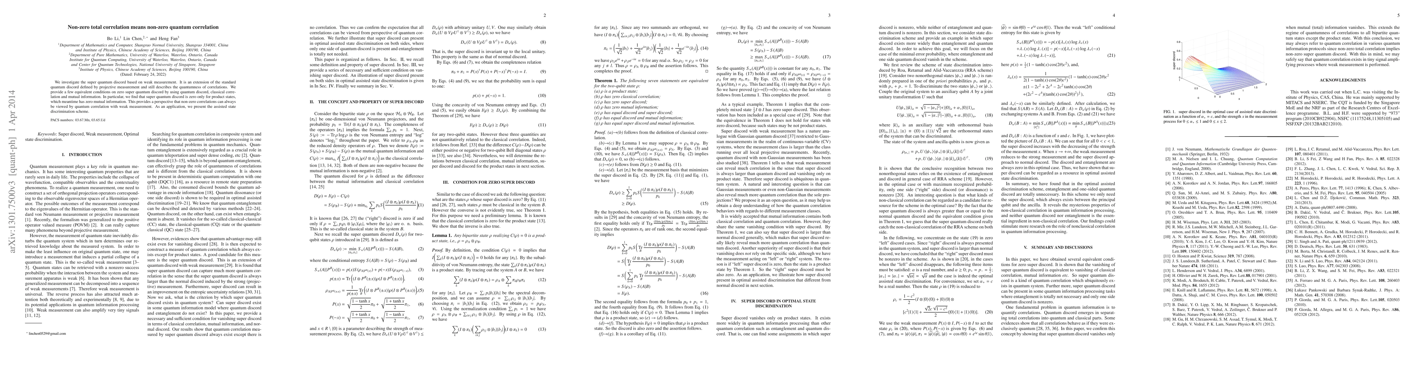 We investigated the super quantum discord based on weak measurements. The super quantum discord is an extension of the standard quantum discord defined by projective measurements and also describes the quantumness of correlations. We provide some equivalent conditions for zero super quantum discord by using quantum discord, classical correlation and mutual information. In particular, we find that the super quantum discord is zero only for product states, which have zero mutual information. This result suggests that non-zero correlations can always be detected using the quantum correlation with weak measurements. As an example, we present the assisted state-discrimination method.