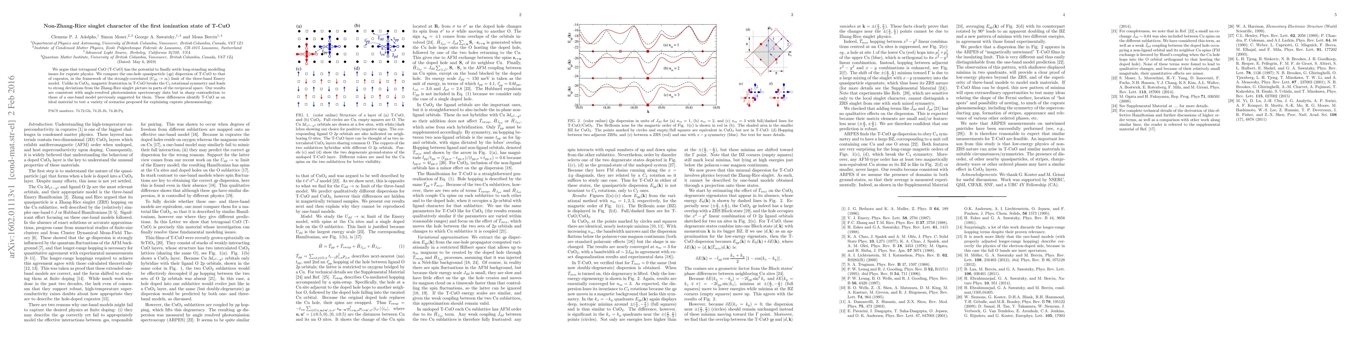 This paper demonstrates that tetragonal CuO (T-CuO) breaks the Zhang-Rice singlet character in its first ionization state, contrasting with cuprate models, due to magnetic frustration and the breaking of $C_4$ rotational symmetry. The findings support angle-resolved photoemission spectroscopy data and challenge one-band model predictions, positioning T-CuO as a key material for testing theories of cuprate physics.