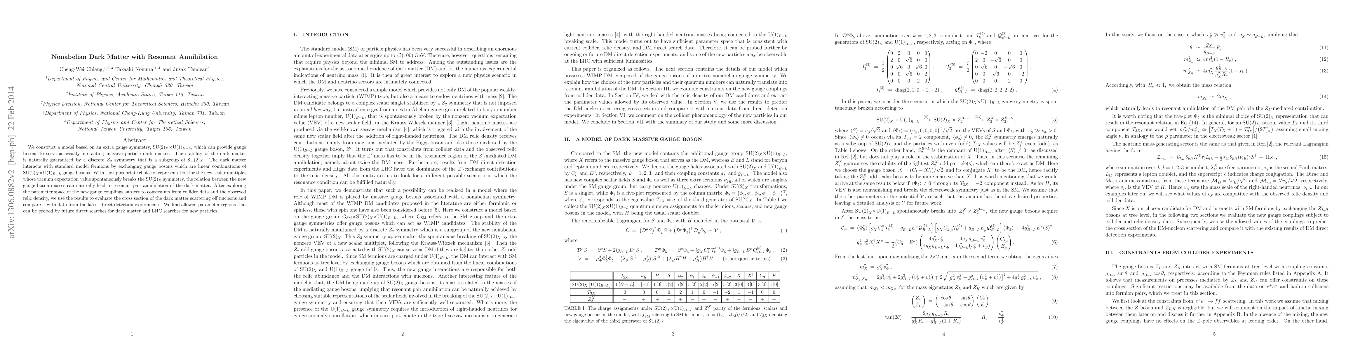This paper proposes a nonabelian dark matter model based on an extra gauge symmetry, SU(2)_X x U(1)_{B-L}, where dark matter stability is ensured by a Z_2 symmetry. It explores resonant annihilation mechanisms and evaluates the model's compatibility with collider data and direct detection experiments, identifying regions that future searches may probe.