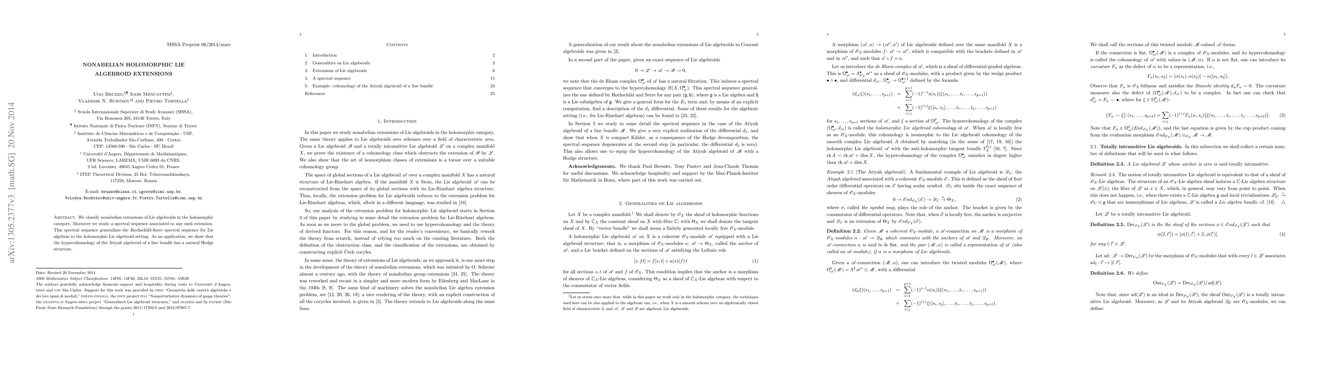 This paper classifies nonabelian holomorphic extensions of Lie algebroids and introduces a spectral sequence that generalizes the Hochschild-Serre sequence, leading to a Hodge structure on the hypercohomology of the Atiyah algebroid of a line bundle.