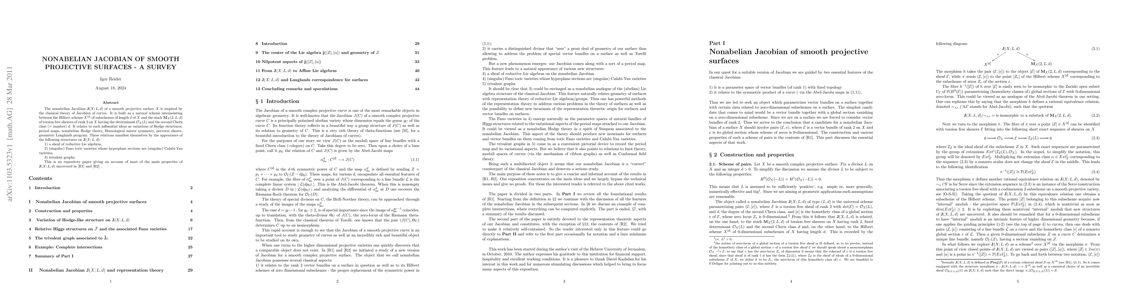The nonabelian Jacobian $\JA$ of a smooth projective surface $X$ is inspired by the classical theory of Jacobian of curves. It is built as a natural scheme interpolating between the Hilbert scheme $\XD$ of subschemes of length $d$ of $X$ and the stack ${\bf M}_X (2,L,d)$ of torsion free sheaves of rank 2 on $X$ having the determinant $\OO_X (L)$ and the second Chern class (= number) $d$. It relates to such influential ideas as variations of Hodge structures, period maps, nonabelian Hodge theory, Homological mirror symmetry, perverse sheave, geometric Langlands program. These relations manifest themselves by the appearance of the following structures on $\JA$: 1) a sheaf of reductive Lie algebras, 2) (singular) Fano toric varieties whose hyperplane sections are (singular) Calabi-Yau varieties, 3) trivalent graphs. This is an expository paper giving an account of most of the main properties of $\JA$ uncovered in [R1] and [R2].