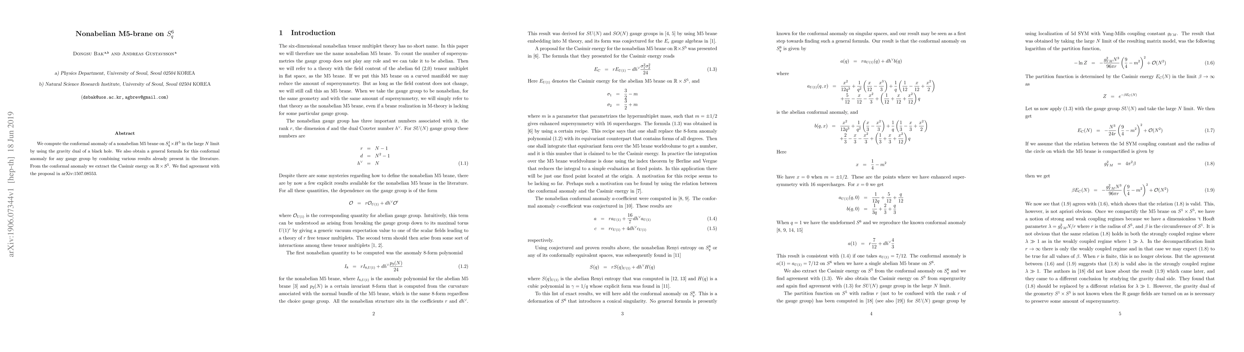 This paper computes the conformal anomaly of a nonabelian M5-brane on $S^1_q\times H^5$ in the large $N$ limit via its gravity dual black hole and provides a general formula for any gauge group. It also extracts the Casimir energy on $\mathbb{R} \times S^5$, confirming results from arXiv:1507.08553.