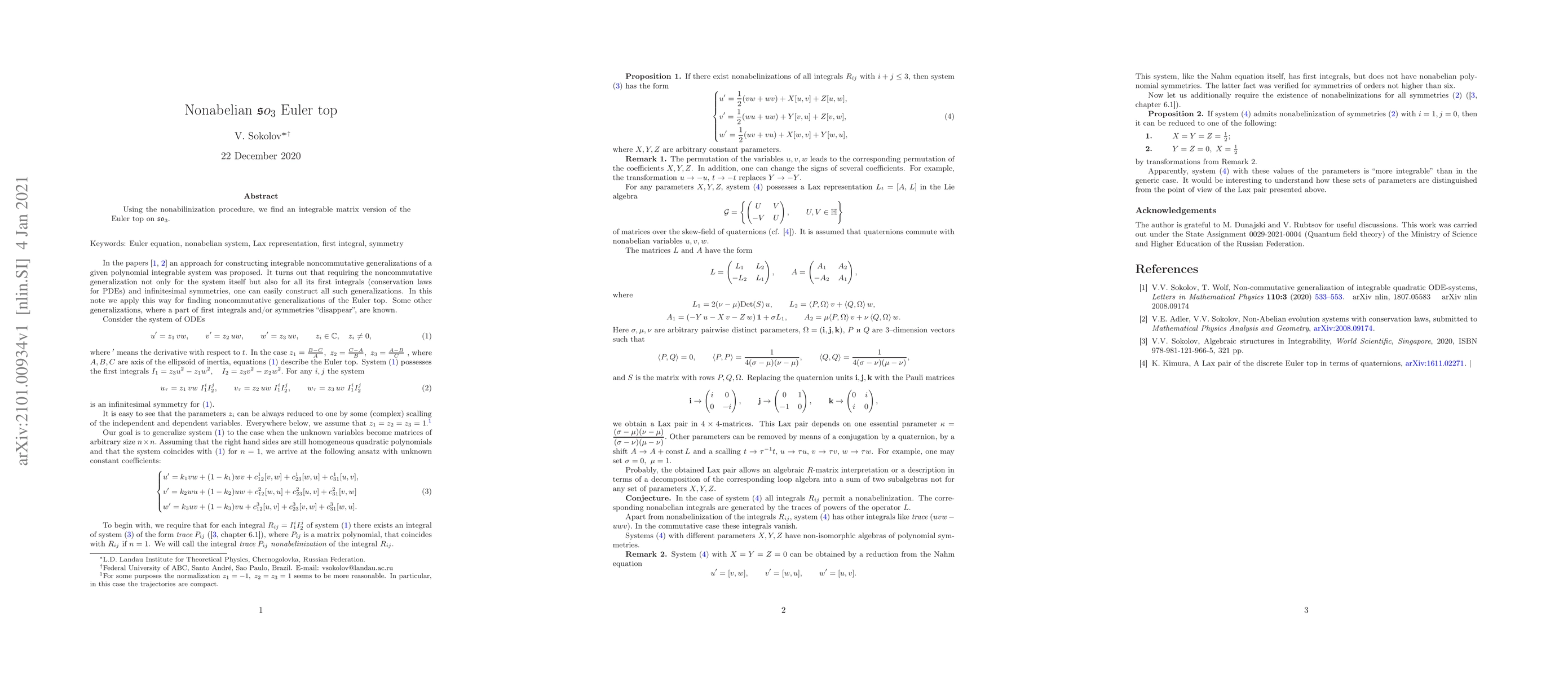 Using the nonabilinization procedure, we find an integrable matrix version of the Euler top on $\mathfrak{so}_3$