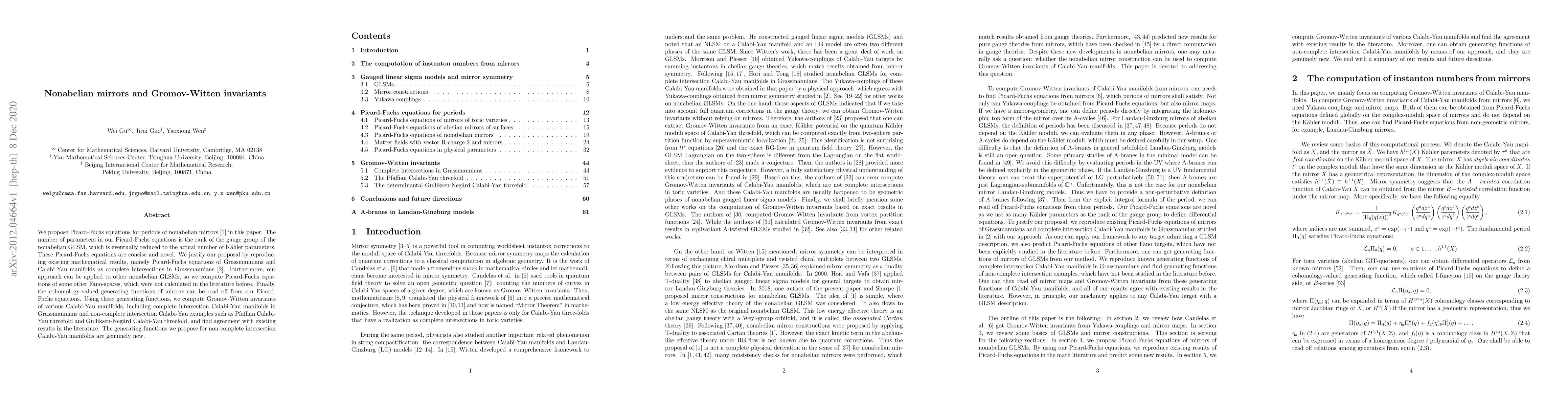 This paper proposes novel Picard-Fuchs equations for periods of nonabelian mirrors, demonstrating their applicability through known results and introducing new equations for Fano-spaces. It computes Gromov-Witten invariants for various Calabi-Yau manifolds, validating the method with existing data and introducing new generating functions for non-complete intersection cases.