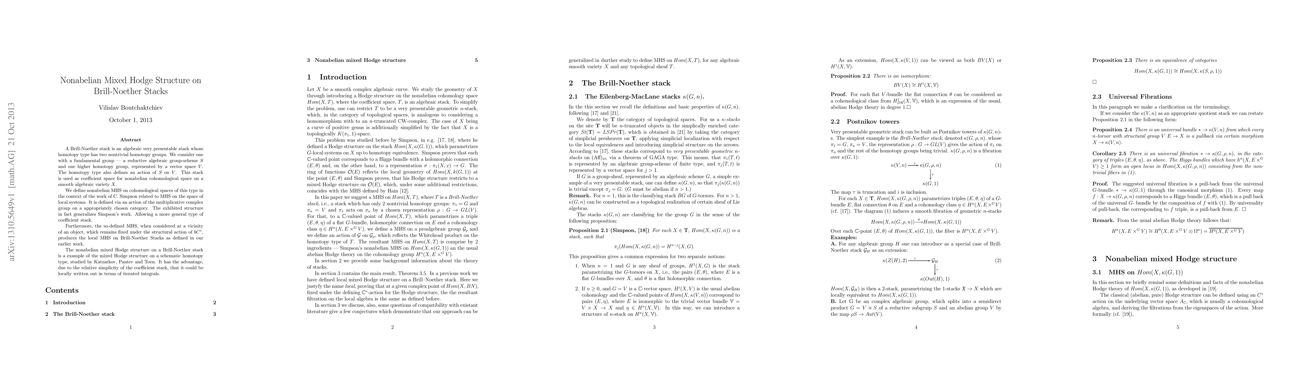 This paper introduces a nonabelian mixed Hodge structure (MHS) on Brill-Noether stacks, generalizing Simpson's work on MHS for local systems. The structure is defined using a reductive algebraic group-scheme and a vector space, allowing for a broader coefficient stack.