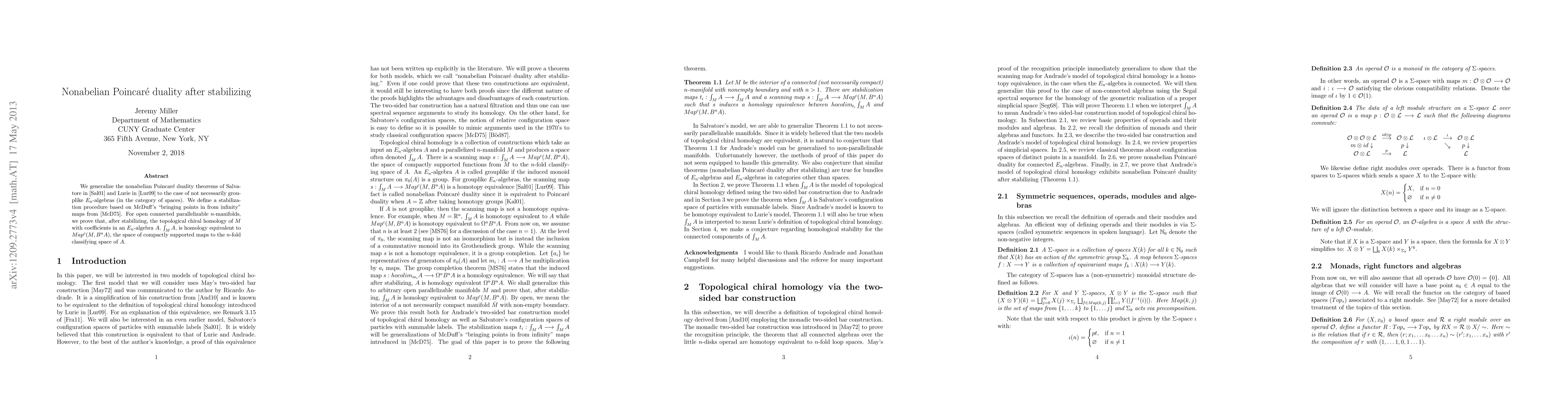This paper generalizes nonabelian Poincaré duality to non-grouplike E_n-algebras in the category of spaces, using a stabilization procedure inspired by McDuff's maps. It proves that for open connected parallelizable n-manifolds, topological chiral homology stabilizes to a homology equivalence with the space of compactly supported maps to the n-fold classifying space of the algebra.