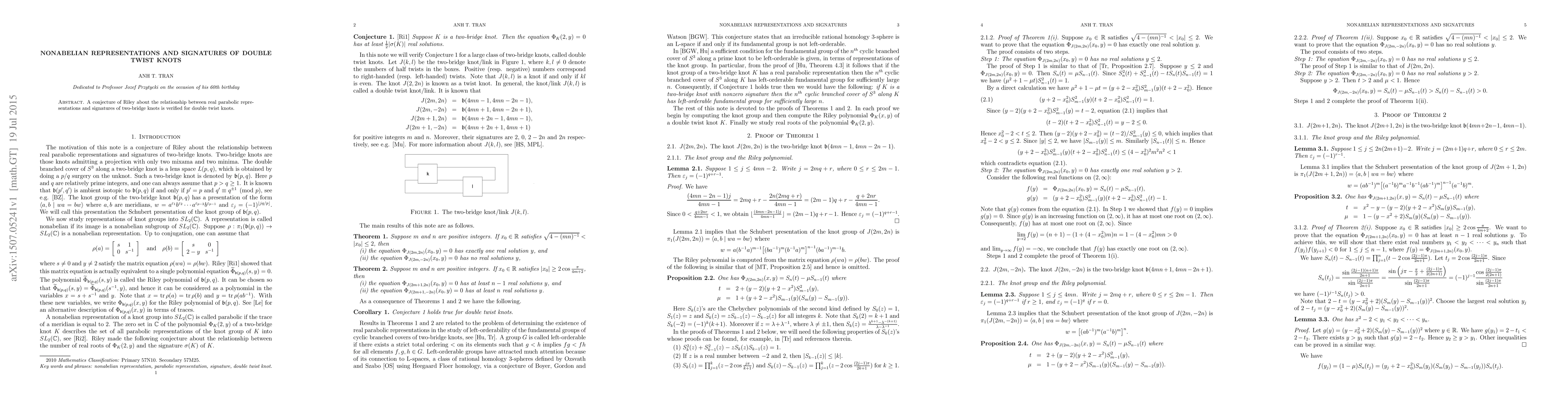 Summary: This paper verifies Riley's conjecture regarding the connection between real parabolic representations and the signatures of double twist knots, thereby establishing a significant link in knot theory.