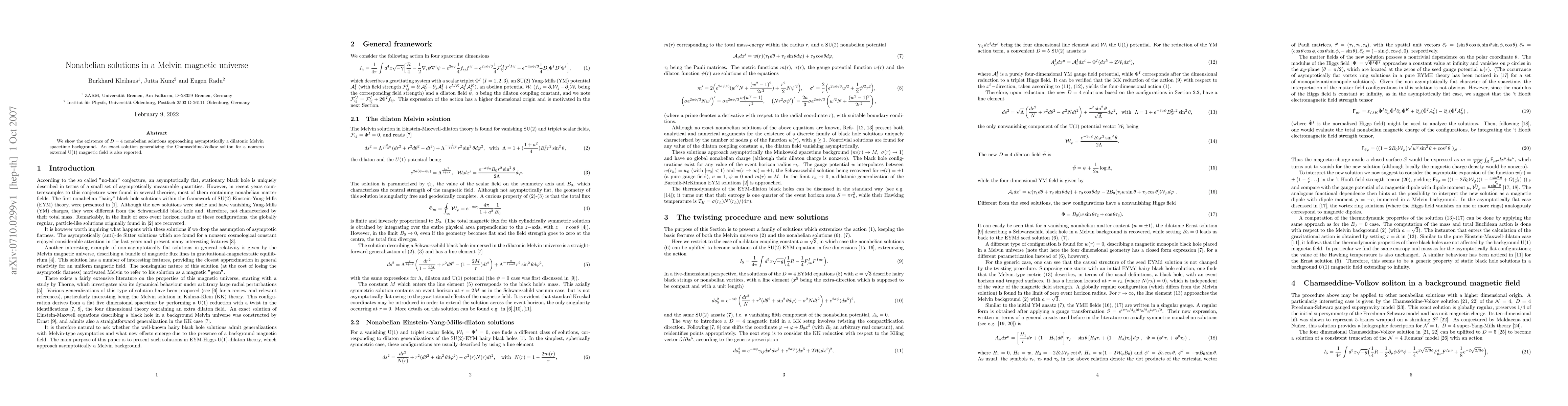 This paper demonstrates the existence of D=4 nonabelian solutions that converge asymptotically to a dilatonic Melvin magnetic universe background. It also presents an exact solution extending the Chamseddine-Volkov soliton under a nonzero external U(1) magnetic field.