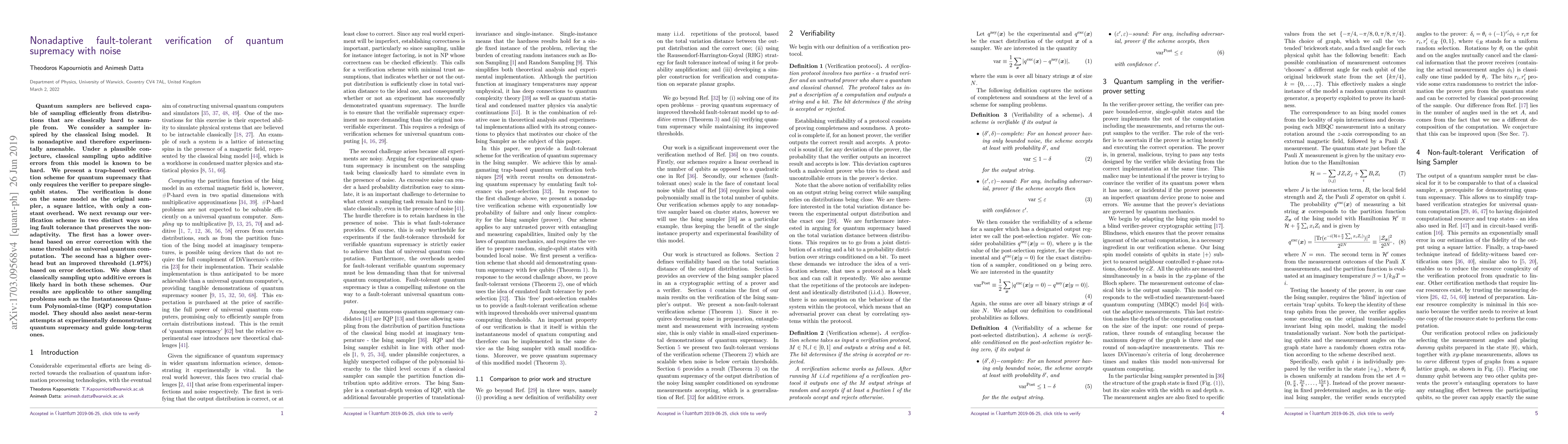 Quantum samplers are believed capable of sampling efficiently from distributions that are classically hard to sample from. We consider a sampler inspired by the classical Ising model. It is nonadaptive and therefore experimentally amenable. Under a plausible conjecture, classical sampling upto additive errors from this model is known to be hard. We present a trap-based verification scheme for quantum supremacy that only requires the verifier to prepare single-qubit states. The verification is done on the same model as the original sampler, a square lattice, with only a constant overhead. We next revamp our verification scheme in two distinct ways using fault tolerance that preserves the nonadaptivity. The first has a lower overhead based on error correction with the same threshold as universal quantum computation. The second has a higher overhead but an improved threshold (1.97\%) based on error detection. We show that classically sampling upto additive errors is likely hard in both these schemes. Our results are applicable to other sampling problems such as the Instantaneous Quantum Polynomial-time (IQP) computation model. They should also assist near-term attempts at experimentally demonstrating quantum supremacy and guide long-term ones.