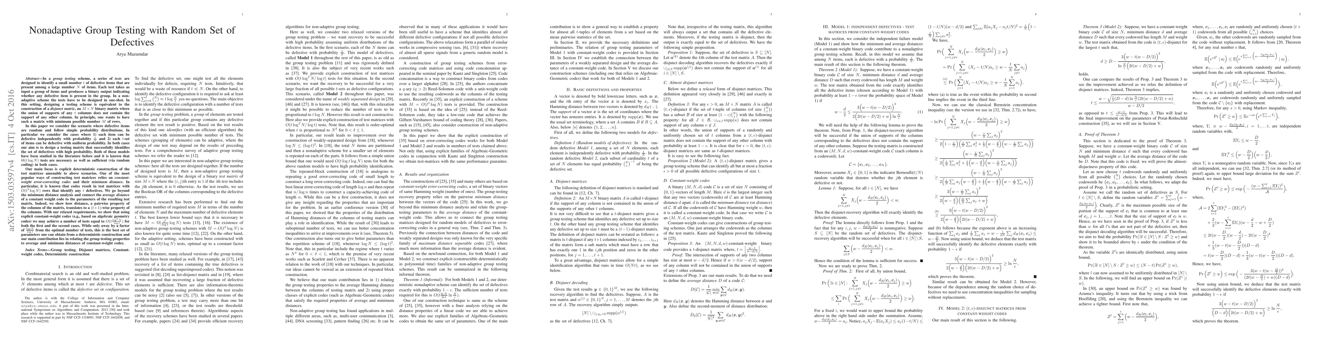In a group testing scheme, a set of tests is designed to identify a small number $t$ of defective items that are present among a large number $N$ of items. Each test takes as input a group of items and produces a binary output indicating whether any defective item is present in the group. In a non-adaptive scheme designing a testing scheme is equivalent to the construction of a disjunct matrix, an $M \times N$ binary matrix where the union of supports of any $t$ columns does not contain the support of any other column. In this paper we consider the scenario where defective items are random and follow simple probability distributions. In particular we consider the cases where 1) each item can be defective independently with probability $\frac{t}{N}$ and 2) each $t$-set of items can be defective with uniform probability. In both cases our aim is to design a testing matrix that successfully identifies the set of defectives with high probability. Both of these models have been studied in the literature before and it is known that $O(t\log N)$ tests are necessary as well as sufficient (via random coding) in both cases. Our main focus is explicit deterministic construction of the test matrices amenable to above scenarios. One of the most popular ways of constructing test matrices relies on \emph{constant-weight error-correcting codes} and their minimum distance. We go beyond the minimum distance analysis and connect the average distance of a constant weight code to the parameters of the resulting test matrix. With our relaxed requirements, we show that using explicit constant-weight codes (e.g., based on algebraic geometry codes) we may achieve a number of tests equal to $O(t \frac{\log^2 N}{ \log t})$ for both the first and the second cases.