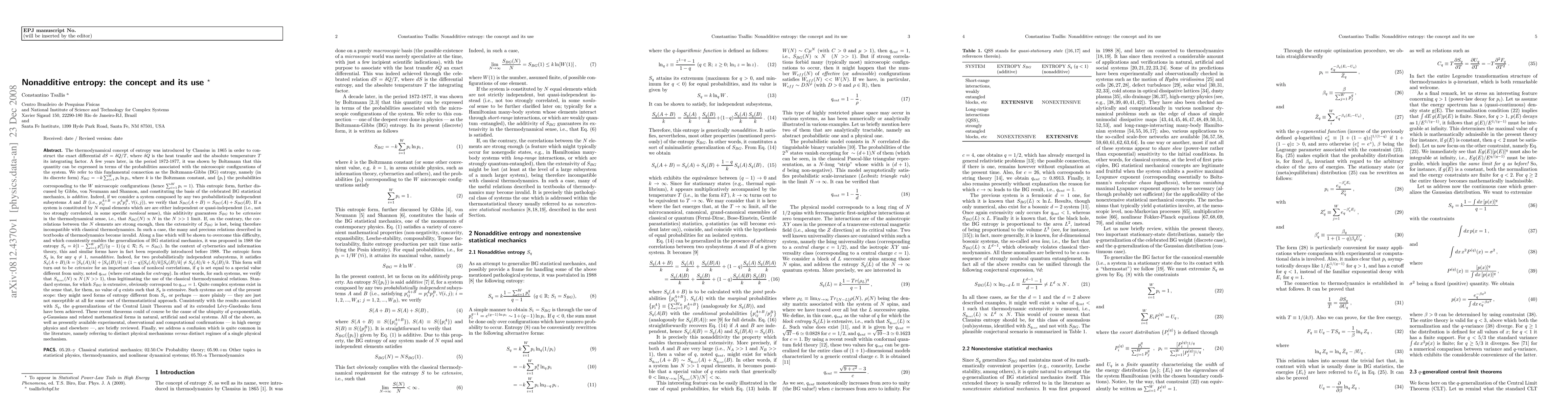 The research explores nonadditive entropy, specifically the entropic form $S_q$ for any $q eq 1$, which is nonadditive for independent subsystems but becomes extensive for a class of nonlocal correlations when $q = q_{ent}$. The paper reviews the $q$-generalizations of the Central Limit Theorem and their implications in natural, artificial, and social systems.