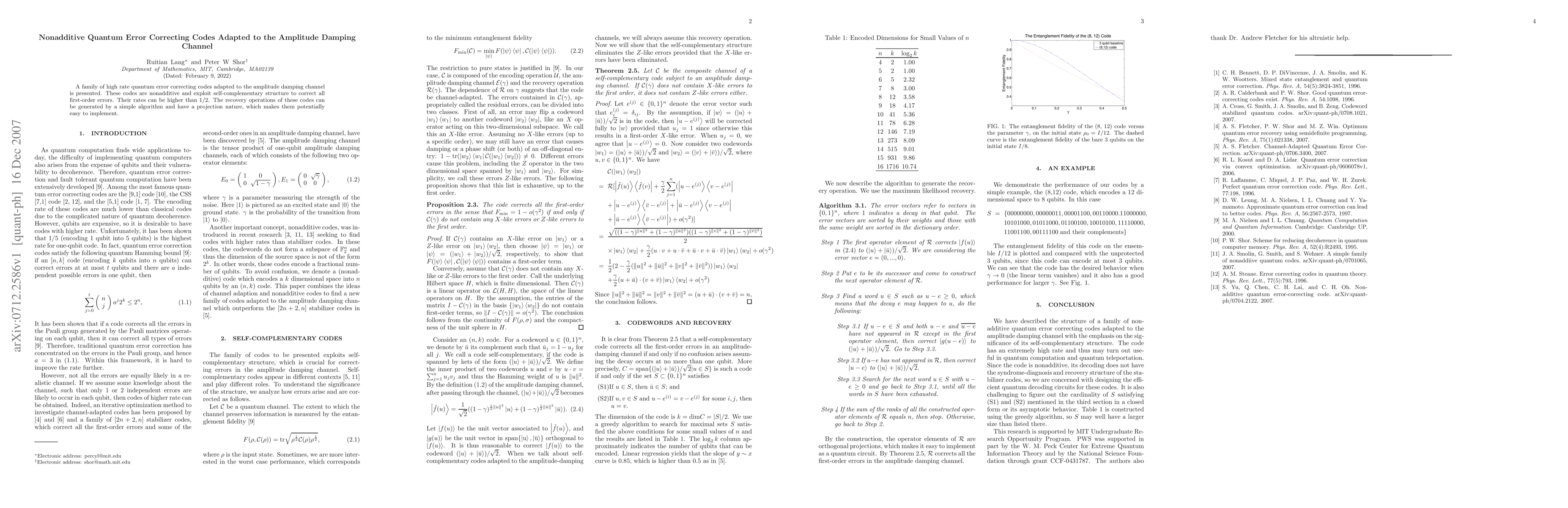 A family of high rate quantum error correcting codes adapted to the amplitude damping channel is presented. These codes are nonadditive and exploit self-complementarity structure to correct all first-order errors. Their rates can be higher than 1/2. The recovery operations of these codes can be generated by a simple algorithm and have a projection nature, which makes them potentially easy to implement.