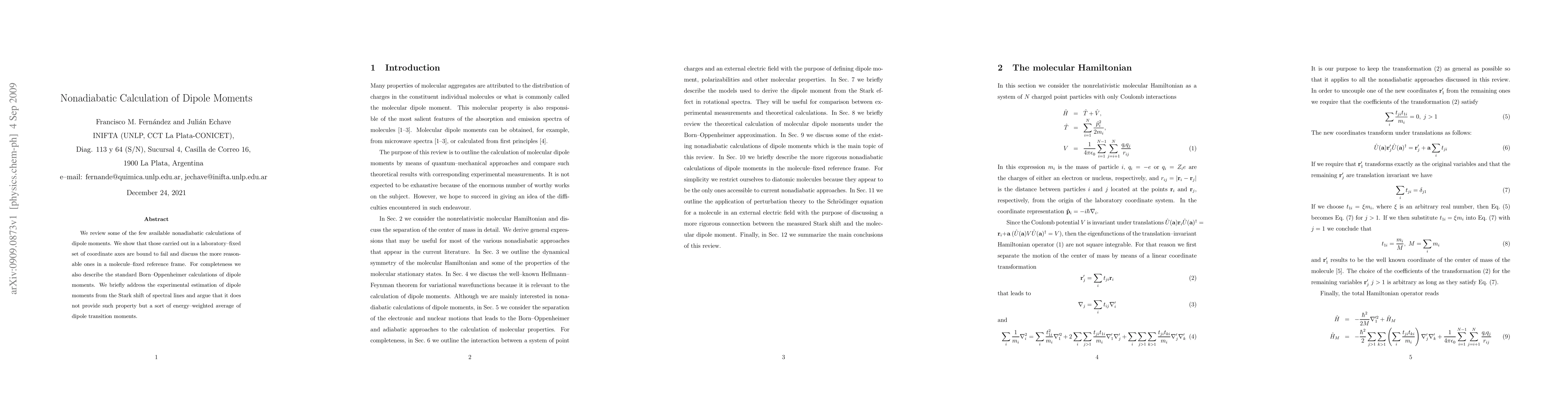 This paper reviews nonadiabatic calculations of dipole moments, highlighting the failure of laboratory-fixed coordinate calculations and advocating for molecule-fixed reference frames. It also discusses the standard Born-Oppenheimer calculations and critiques the experimental estimation of dipole moments via the Stark shift.