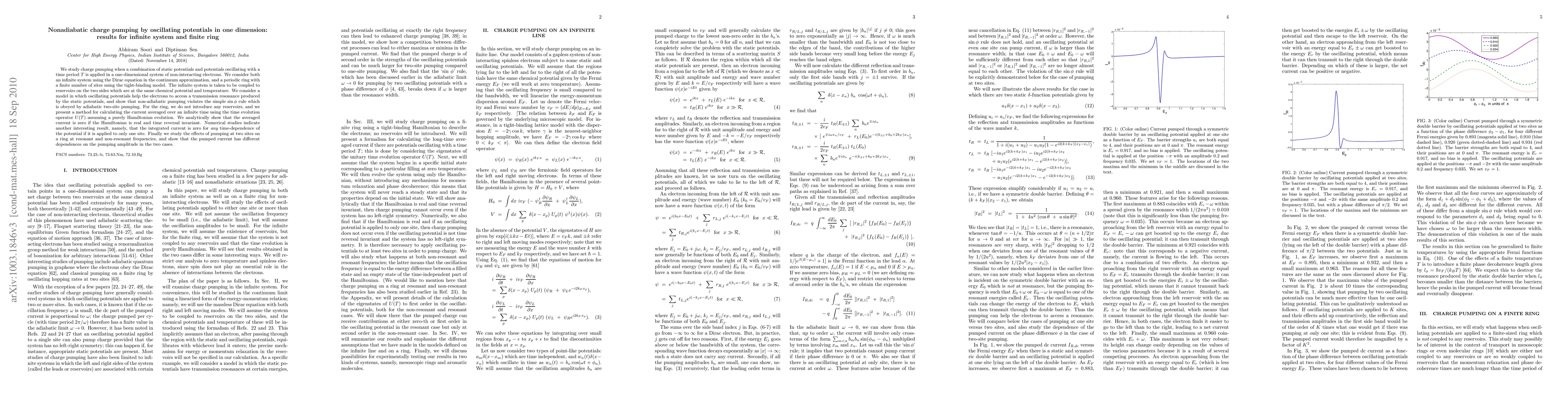 We study charge pumping when a combination of static potentials and potentials oscillating with a time period T is applied in a one-dimensional system of non-interacting electrons. We consider both an infinite system using the Dirac equation in the continuum approximation, and a periodic ring with a finite number of sites using the tight-binding model. The infinite system is taken to be coupled to reservoirs on the two sides which are at the same chemical potential and temperature. We consider a model in which oscillating potentials help the electrons to access a transmission resonance produced by the static potentials, and show that non-adiabatic pumping violates the simple \sin \phi rule which is obeyed by adiabatic two-site pumping. For the ring, we do not introduce any reservoirs, and we present a method for calculating the current averaged over an infinite time using the time evolution operator U(T) assuming a purely Hamiltonian evolution. We analytically show that the averaged current is zero if the Hamiltonian is real and time reversal invariant. Numerical studies indicate another interesting result, namely, that the integrated current is zero for any time-dependence of the potential if it is applied to only one site. Finally we study the effects of pumping at two sites on a ring at resonant and non-resonant frequencies, and show that the pumped current has different dependences on the pumping amplitude in the two cases.