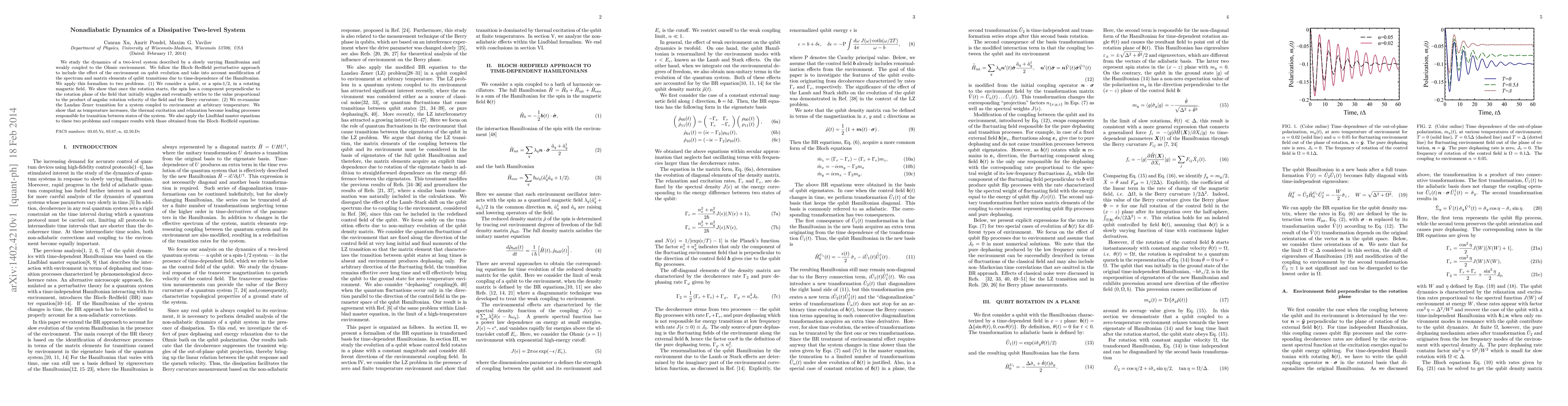 This study investigates the dynamics of a two-level system in a dissipative environment, revealing how temperature affects transition between states and the emergence of perpendicular spin components in a rotating magnetic field.