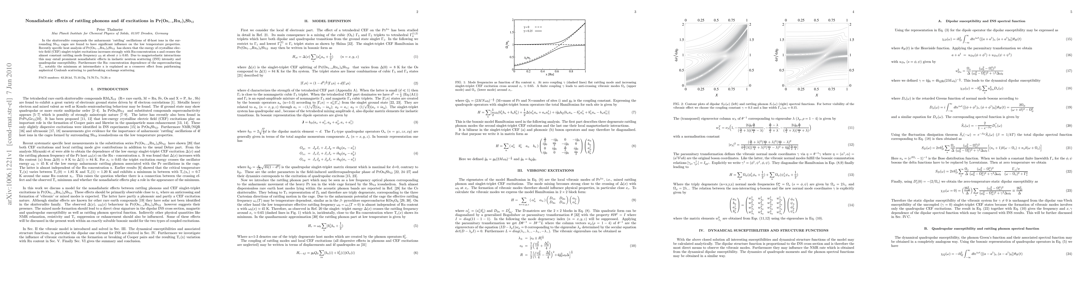 In the skutterudite compounds the anharmonic 'rattling' oscillations of 4f-host ions in the surrounding Sb12 cages are found to have significant influence on the low temperature properties. Recently specific heat analysis of Pr(Os{1-x}Ru{x})4Sb12 has shown that the energy of crystalline electric field (CEF) singlet-triplet excitations increases strongly with Ru-concentration x and crosses the almost constant rattling mode frequency $\omega_0$ at about x ~ 0.65. Due to magnetoelastic interactions this may entail prominent nonadiabatic effects in inelastic neutron scattering (INS) intensity and quadrupolar susceptibility. Furthermore the Ru- concentration dependence of the superconducting Tc, notably the minimum at intermediate x is explained as a crossover effect from pairforming aspherical Coulomb scattering to pairbreaking exchange scattering.