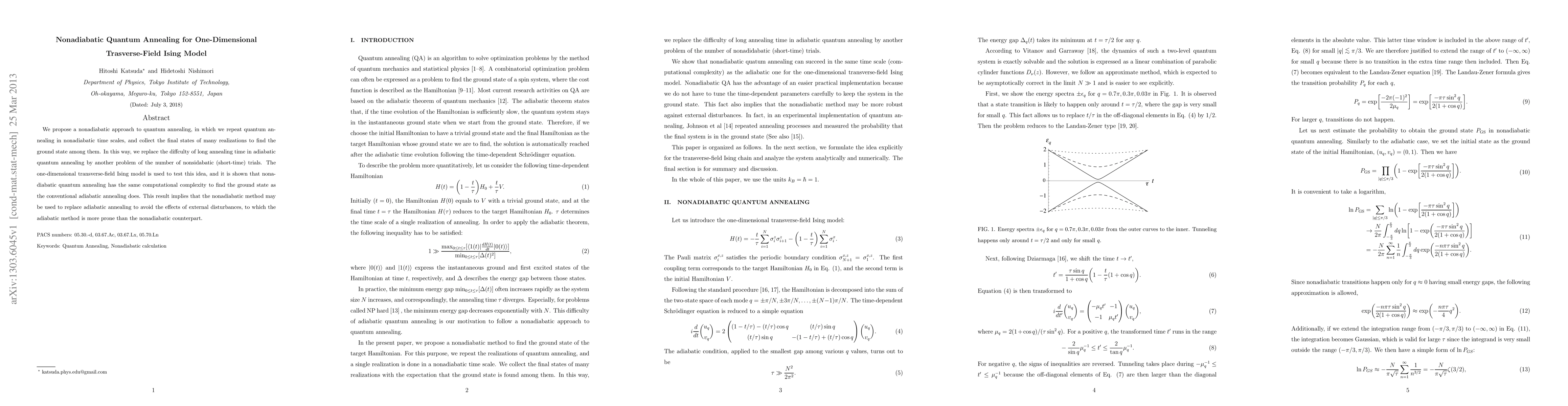 This paper proposes a nonadiabatic quantum annealing method for solving the one-dimensional transverse-field Ising model, demonstrating that it maintains the same computational complexity as adiabatic annealing while potentially offering better resilience to external disturbances.