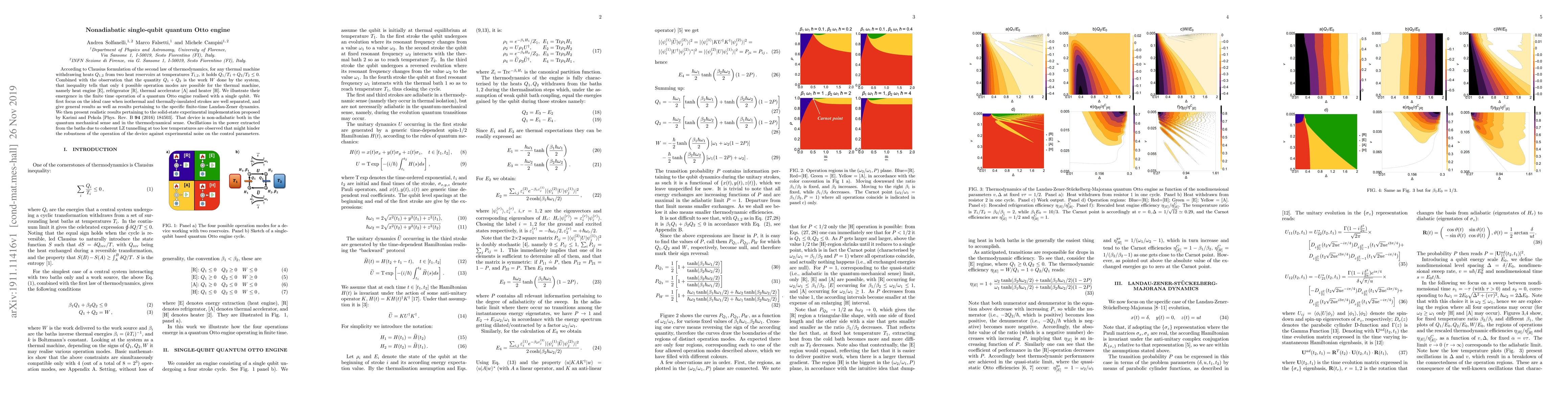 According to Clausius formulation of the second law of thermodynamics, for any thermal machine withdrawing heats $Q_{1,2}$ from two heat reservoirs at temperatures $T_{1,2}$, it holds $Q_1/T_1+Q_2/T_2 \leq 0$. Combined with the observation that the quantity $Q_1+Q_2$ is the work $W$ done by the system, that inequality tells that only 4 possible operation modes are possible for the thermal machine, namely heat engine [E], refrigerator [R], thermal accelerator [A] and heater [H]. We illustrate their emergence in the finite time operation of a quantum Otto engine realised with a single qubit. We first focus on the ideal case when isothermal and thermally-insulated strokes are well separated, and give general results as well as results pertaining to the specific finite-time Landau-Zener dynamics. We then present realistic results pertaining to the solid-state experimental implementation proposed by Karimi and Pekola [Phys. Rev. B \textbf{94} (2016) 184503]. That device is non-adiabatic both in the quantum mechanical sense and in the thermodynamical sense. Oscillations in the power extracted from the baths due to coherent LZ tunnelling at too low temperatures are observed that might hinder the robustness of the operation of the device against experimental noise on the control parameters.