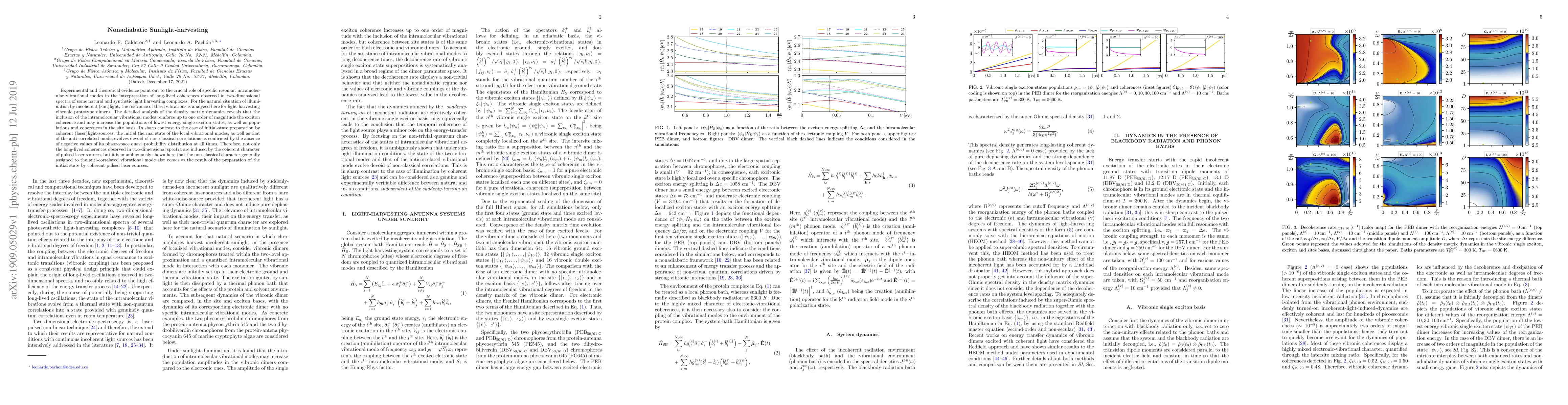 Experimental and theoretical evidence point out to the crucial role of specific resonant intramolecular vibrational modes in the interpretation of long-lived coherences observed in two-dimensional spectra of some natural and synthetic light harvesting complexes. For the natural situation of illumination by incoherent (sun)light, the relevance of these vibrations is analyzed here for light-harvesting vibronic prototype dimers. The detailed analysis of the density matrix dynamics reveals that the inclusion of the intramolecular vibrational modes reinforce up to one order of magnitude the exciton coherence and may increase the populations of lowest energy single exciton states, as well as populations and coherences in the site basis. In sharp contrast to the case of initial-state preparation by coherent (laser)light-sources, the initial thermal state of the local vibrational modes, as well as that of the anti-correlated mode, evolves devoid of non-classical correlations as confirmed by the absence of negative values of its phase-space quasi-probability distribution at all times. Therefore, not only the long-lived coherences observed in two-dimensional spectra are induced by the coherent character of pulsed laser sources, but it is unambiguously shown here that the non-classical character generally assigned to the anti-correlated vibrational mode also comes as the result of the preparation of the initial state by coherent pulsed laser sources.