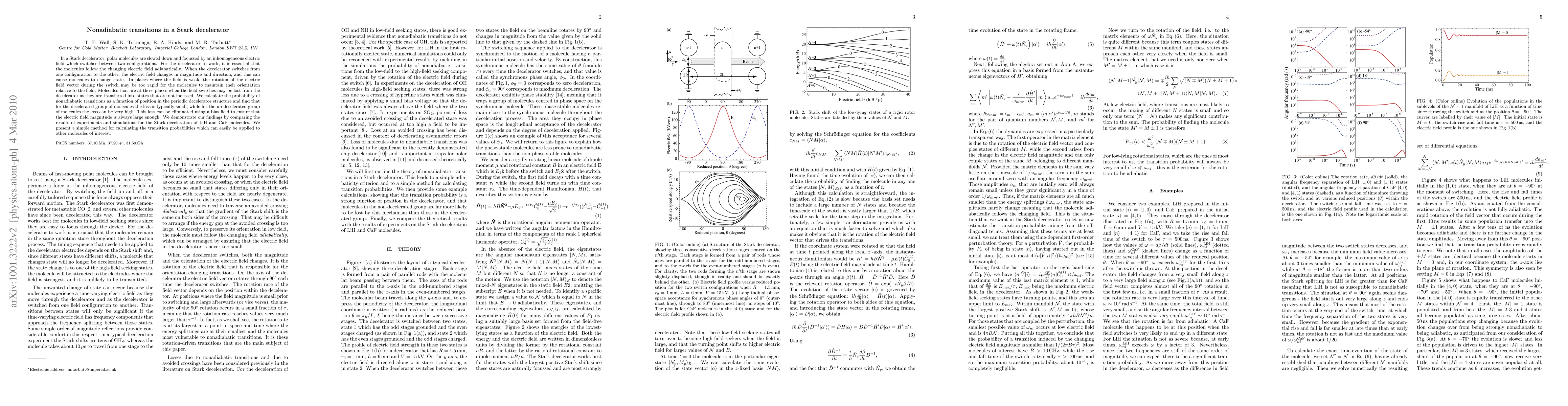 This paper investigates nonadiabatic transitions in a Stark decelerator, where rapid changes in an electric field can cause polar molecules to lose orientation and exit the decelerator. The authors calculate transition probabilities and show that losses are typically small for decelerated molecules but can be high for undecelerated ones, proposing a bias field to mitigate these losses. Experimental and simulation results for LiH and CaF molecules validate their findings.