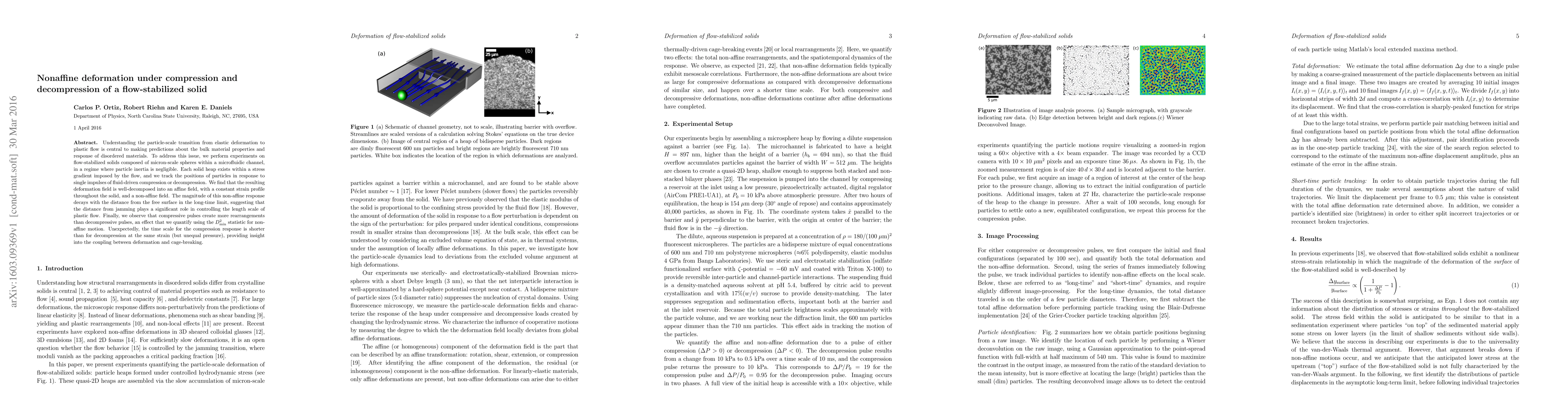 Understanding the particle-scale transition from elastic deformation to plastic flow is central to making predictions about the bulk material properties and response of disordered materials. To address this issue, we perform experiments on flow-stabilized solids composed of micron-scale spheres within a microfluidic channel, in a regime where particle inertia is negligible. Each solid heap exists within a stress gradient imposed by the flow, and we track the positions of particles in response to single impulses of fluid-driven compression or decompression. We find that the resulting deformation field is well-decomposed into an affine field, with a constant strain profile throughout the solid, and a non-affine field. The magnitude of this non-affine response decays with the distance from the free surface in the long-time limit, suggesting that the distance from jamming plays a significant role in controlling the length scale of plastic flow. Finally, we observe that compressive pulses create more rearrangements than decompressive pulses, an effect that we quantify using the $D^2_\mathrm{min}$ statistic for non-affine motion. Unexpectedly, the time scale for the compression response is shorter than for decompression at the same strain (but unequal pressure), providing insight into the coupling between deformation and cage-breaking.