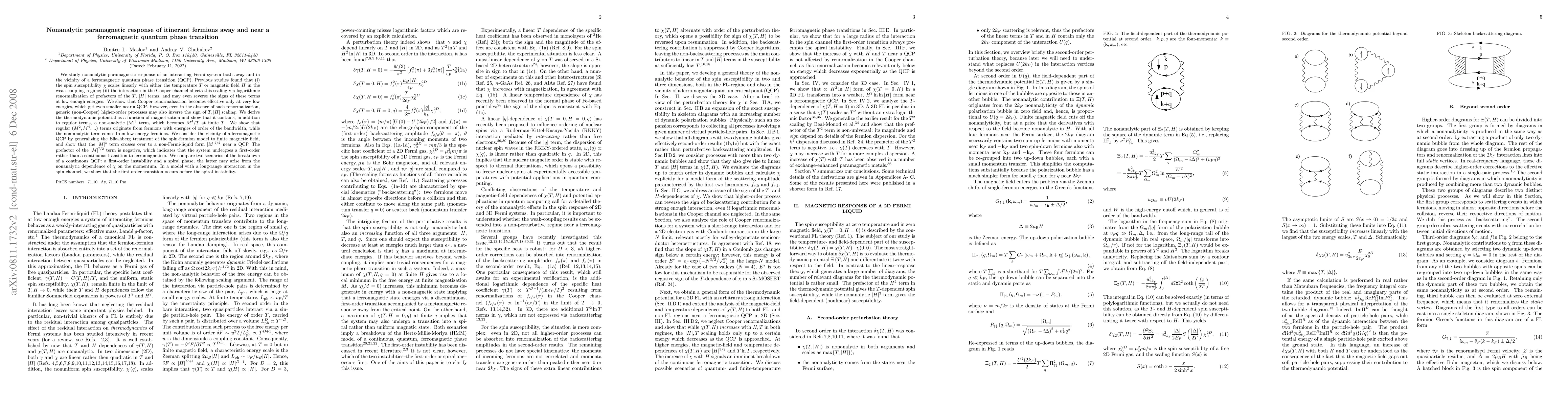 We study nonanalytic paramagnetic response of an interacting Fermi system both away and in the vicinity of a ferromagnetic quantum phase transition (QCP). Previous studies found that (i) the spin susceptibility scales linearly with either the temperature $T$ or magnetic field H in the weak-coupling regime; (ii) the interaction in the Cooper channel affects this scaling via logarithmic renormalization of prefactors of the $T$, |H| terms, and may even reverse the signs of these terms at low enough energies. We show that Cooper renormalization becomes effective only at very low energies, which get even smaller near a QCP. However,even in the absence of such renormalization, generic (non-Cooper) higher-order processes may also inverse the sign of T,|H| scaling. We derive the thermodynamic potential as a function of magnetization and show that it contains, in addition to regular terms, a non-analytic |M|^3 term, which becomes M^4/T at finite $T$. We show that regular (M^2, M^4, ...) terms originate from fermions with energies of order of the bandwidth, while the non-analytic term comes from low-energy fermions. We consider the vicinity of a ferromagnetic QCP by generalizing the Eliashberg treatment of the spin-fermion model to finite magnetic field, and show that the |M|^3 term crosses over to a non-Fermi-liquid form |M|^{7/2} near a QCP. The prefactor of the |M|^{7/2} term is negative, which indicates that the system undergoes a first-order rather than a continuous transition to ferromagnetism. We compare two scenarios of the breakdown of a continuous QCP: a first-order instability and a spiral phase. In a model with a long-range interaction in the spin channel, we show that the first-order transition occurs before the spiral instability.
